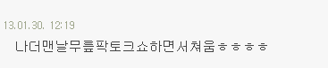 작성자우유딸기 작성시간 13.04.25 (추천놀이) 아 여기서 영감 많이 받아간다!! 시상식과 무릎팍만 찍던 내가 바보엿어 세상엔 더 재미난게 많앗는데!!!!
