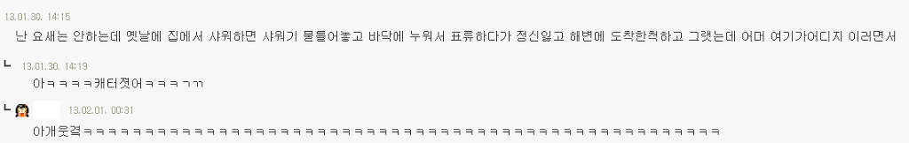 (모배) 난 요새는 안하는데 옛날에 집에서 샤워하면 샤워기 물틀어놓고 바닥에 누워서 표류하다가 정신잃고