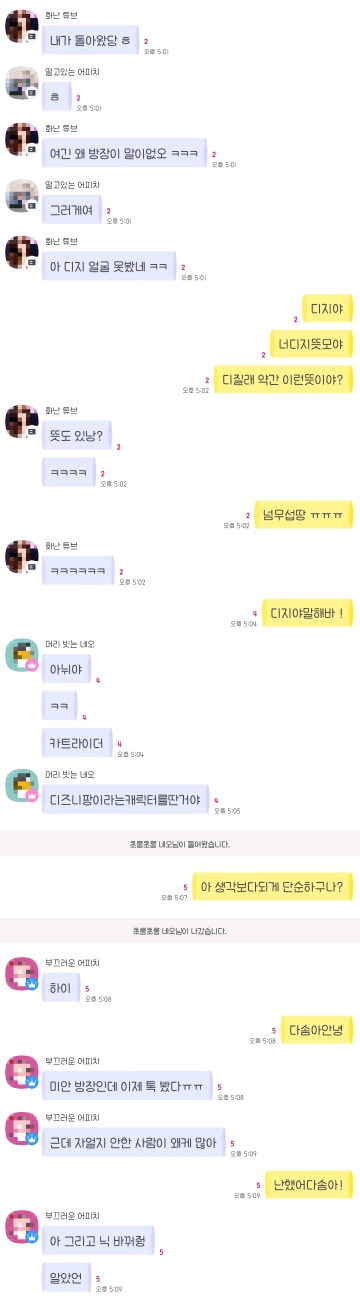 방장님이 자꾸 닉넴바꾸라고 혼내길래 바꾸기싫어서 걍 나와버림 끝,,,,