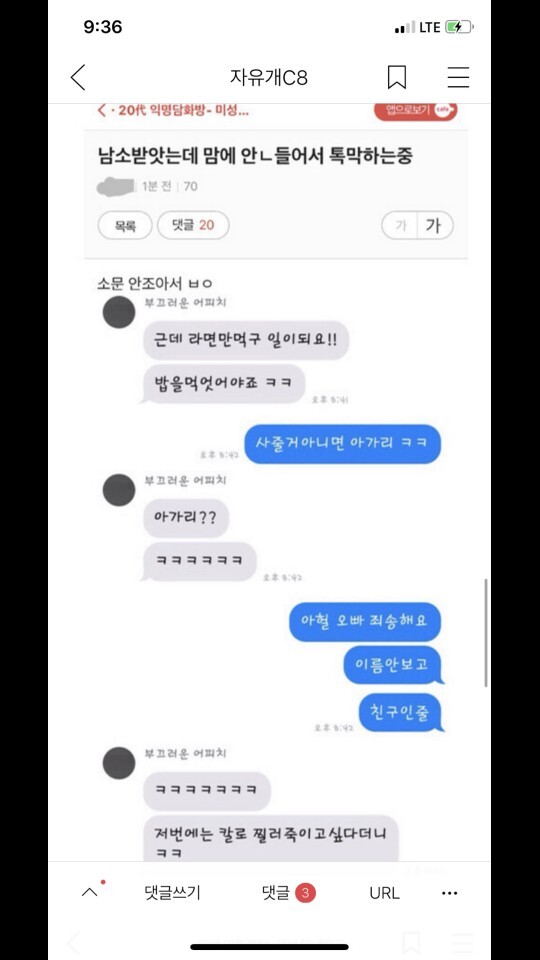 작성자19세 미만 구독불가 작성시간 20.09.30 낙이랑 소개팅카톡ㅋㅋㅋㅋㅋ 저번엔 칼로 찔러죽이고싶다했댘ㅋㅋㅋㅋ