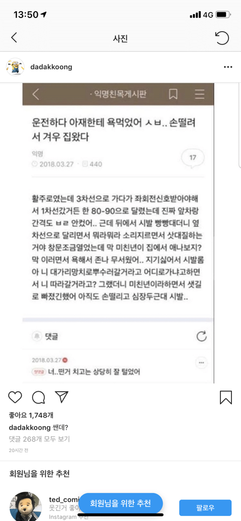작성자비싸do jonna worth it 작성시간 20.11.25 ㅋㅋㅋㅋㅋㅋㅋㅋㅋ나도 매직아이여시랑 비슷한경험잇는데 좌회전 기둘리는데 옆차선에서 창문열고 머라하길래 나도 열고 한남 떠드는동안 암말안하고 눈만 존나쳐다보고잇엇더니 말하다말고 먼저출발함 비슷하지가않은가..