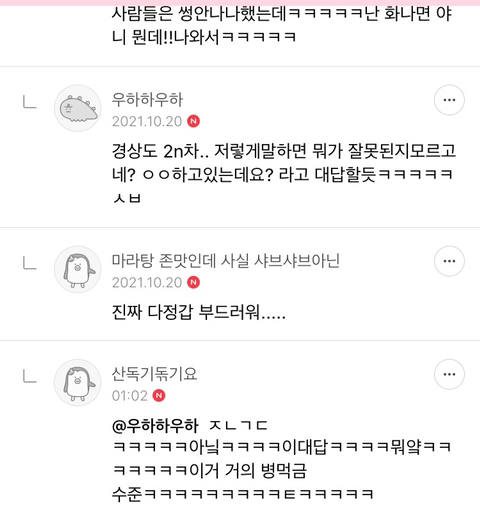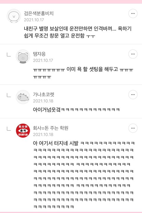 욕하는것도 이상한사람이 있나봐~~ 하고 욕한댘ㅋㅋㅋㅋㅋ졸라 순한맛