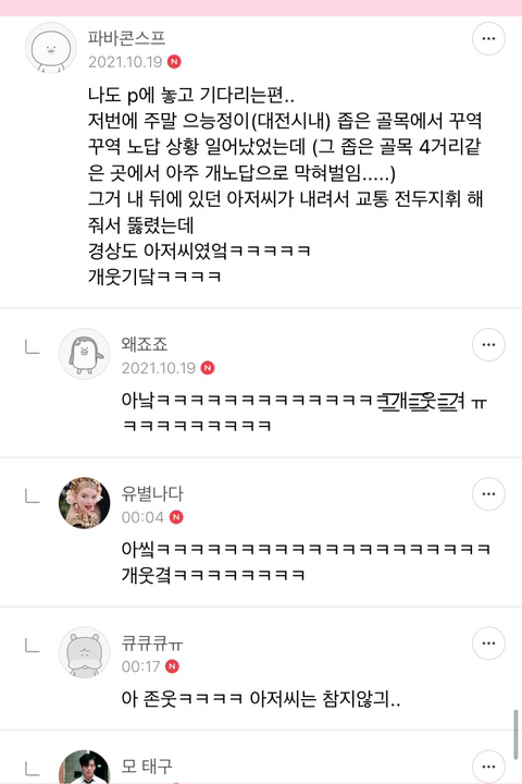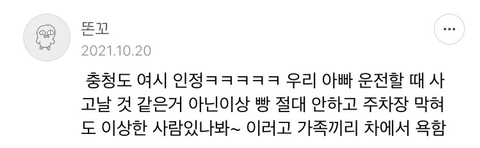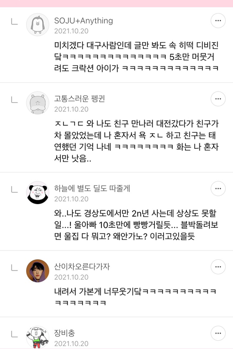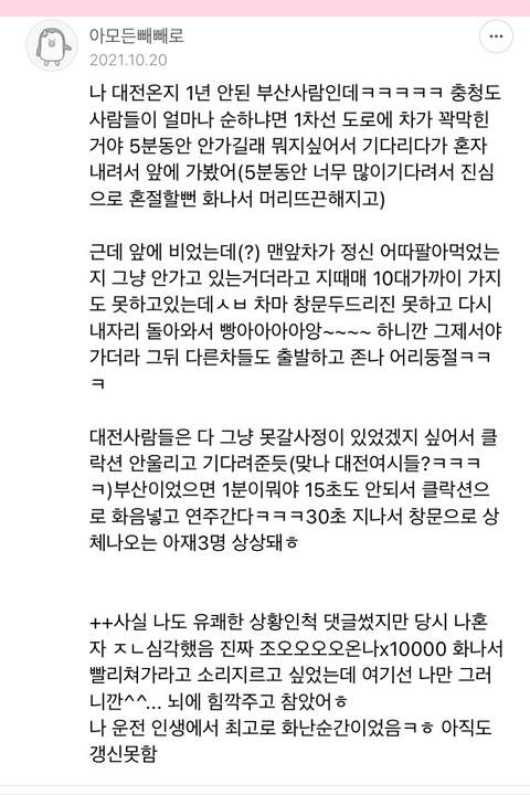 작성자인생은고양이다 작성시간 22.05.30 ㅋㅋㅋㅋㅋㅋㅋㅋㅋㅋ대전 너무공감됔ㅋㅋㅋㅋㅋㅋ 대전사람이고 중간에 5년정도 충청도 타지에서 자취했었는데 진짜 사고날뻔한거외에 클락션소리 들은적이