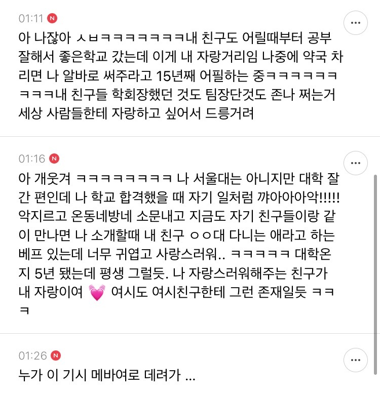 작성자마리 퀴리 작성시간 22.01.01 내 친구가 대단하니까 얼마나 자랑스러워 온동네방네 소문내고 다니고 싶은 거 꾺...참고 사는 거다!!!