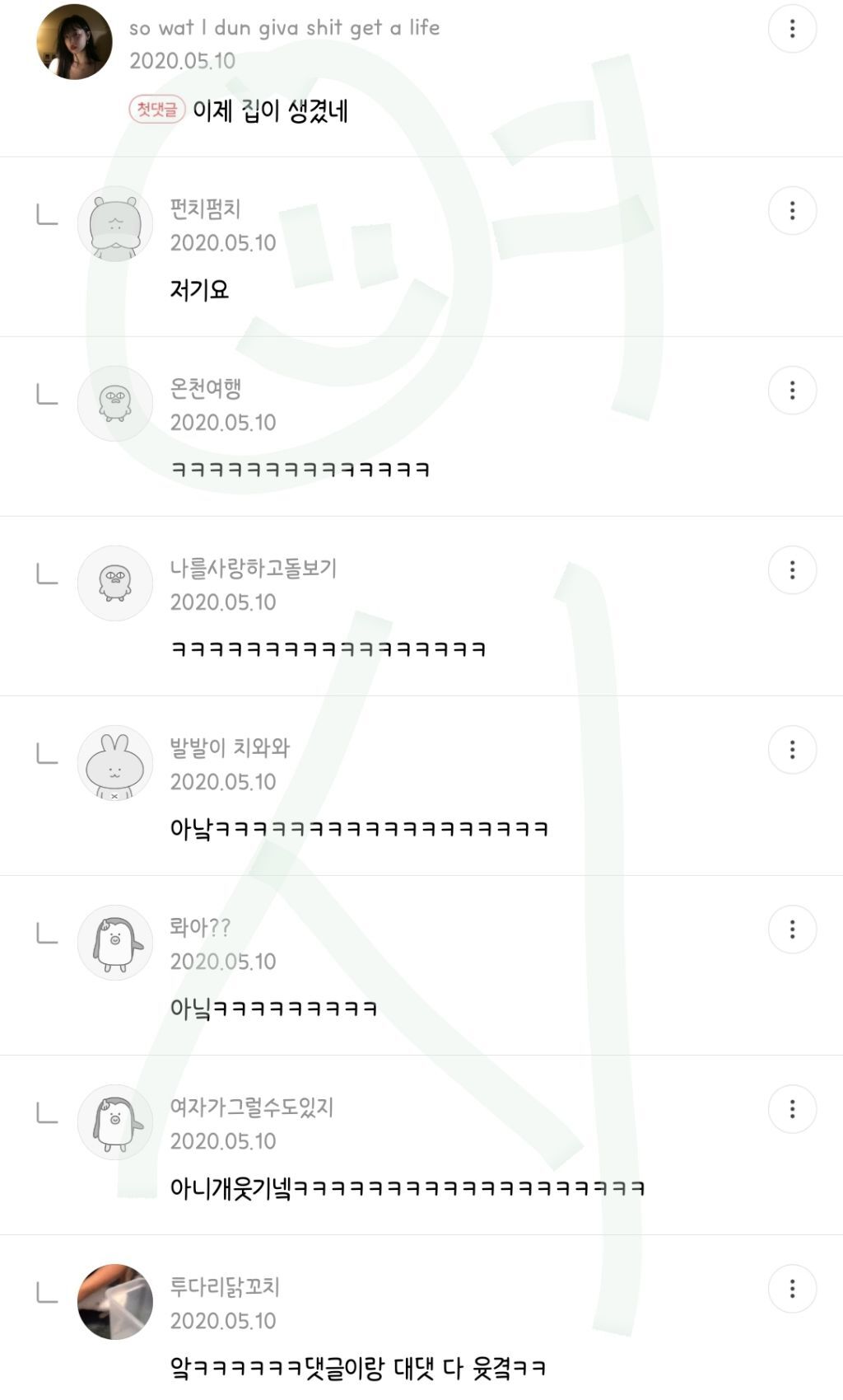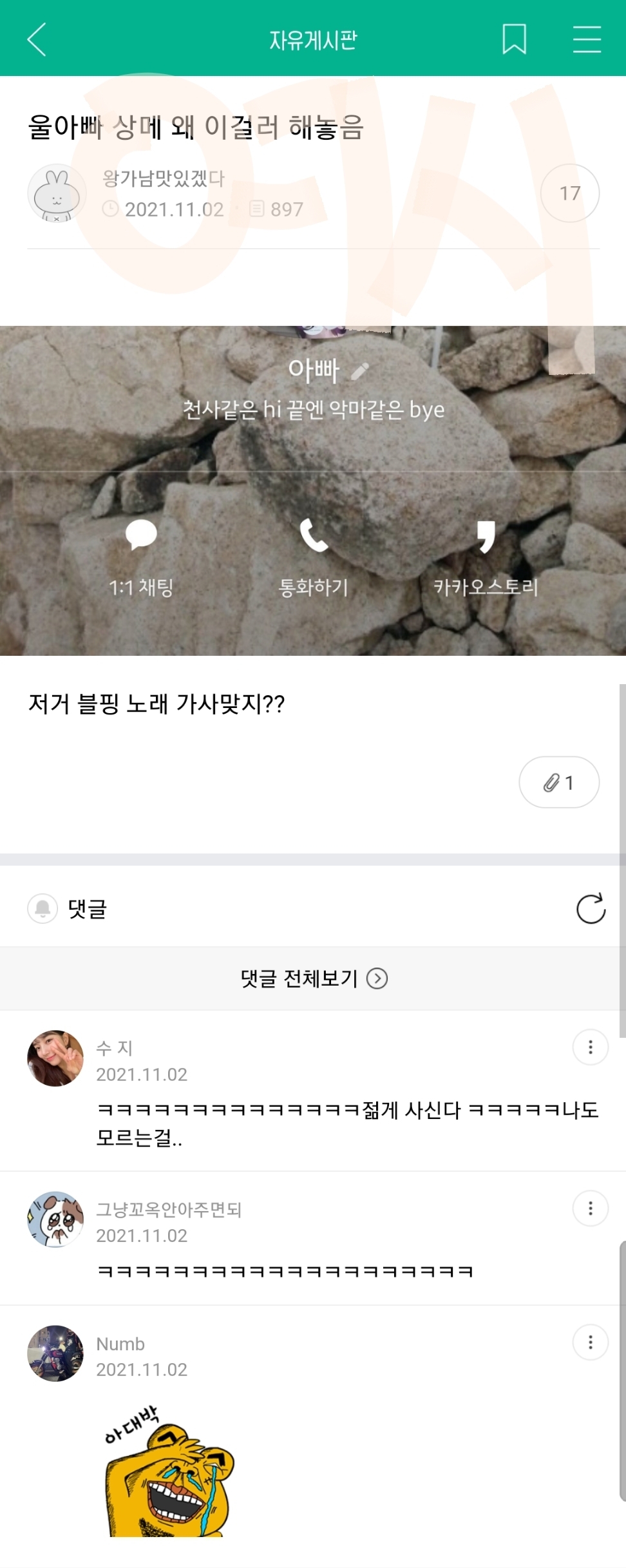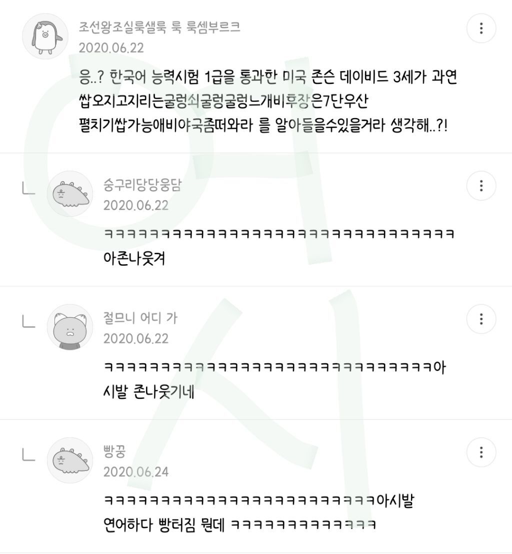 작성자영원이있다면영원히 작성시간 22.07.15 아 심심해서 메바여 연어중인데 개웃기넼ㅋㅋㅋㅋㅋㅋㅋㅋㅋㅋㅋㅋㅋㅋㅋㅋㅋㅋㅋㅋㅋㅋㅋ
