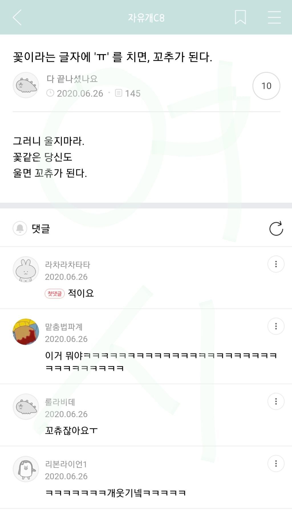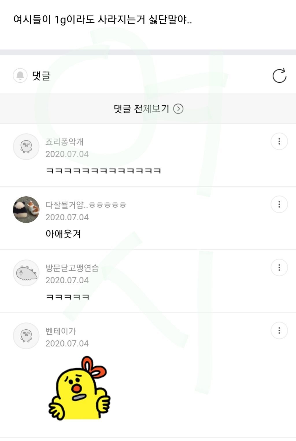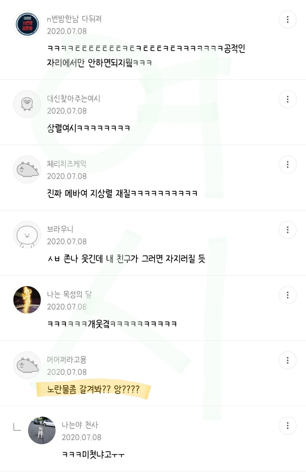 작성자영원이있다면영원히 작성시간 22.07.15 아 심심해서 메바여 연어중인데 개웃기넼ㅋㅋㅋㅋㅋㅋㅋㅋㅋㅋㅋㅋㅋㅋㅋㅋㅋㅋㅋㅋㅋㅋㅋ
