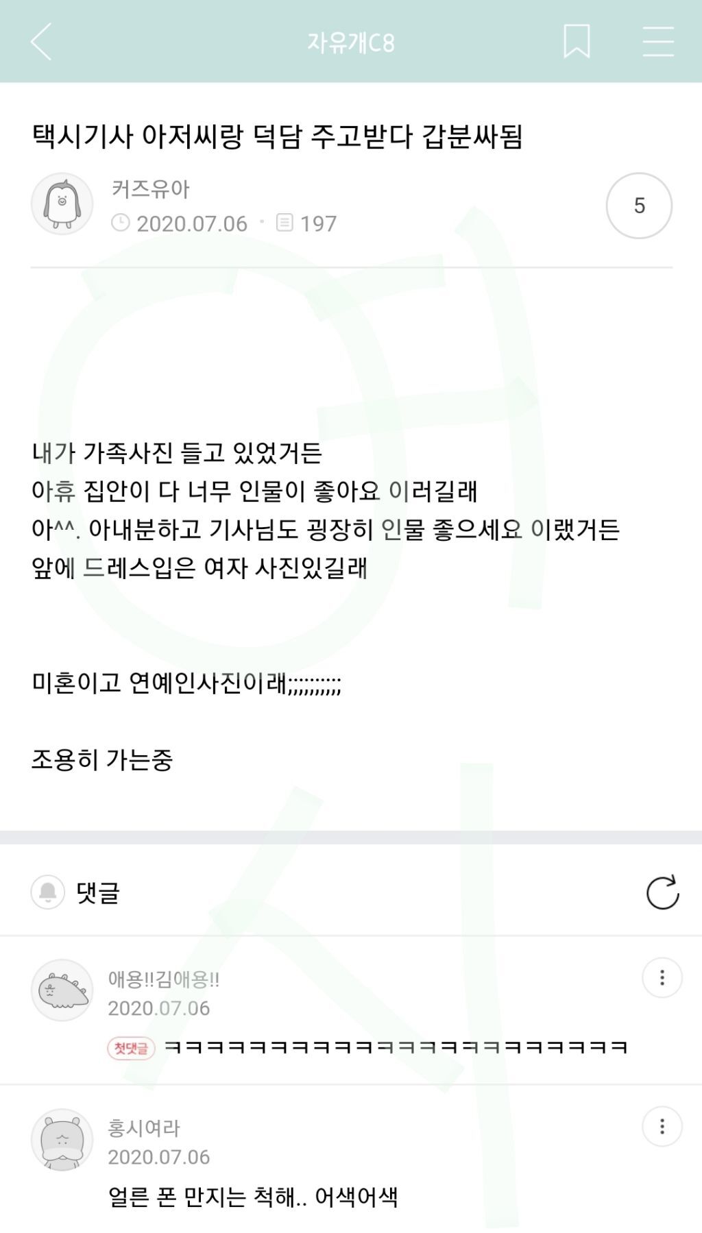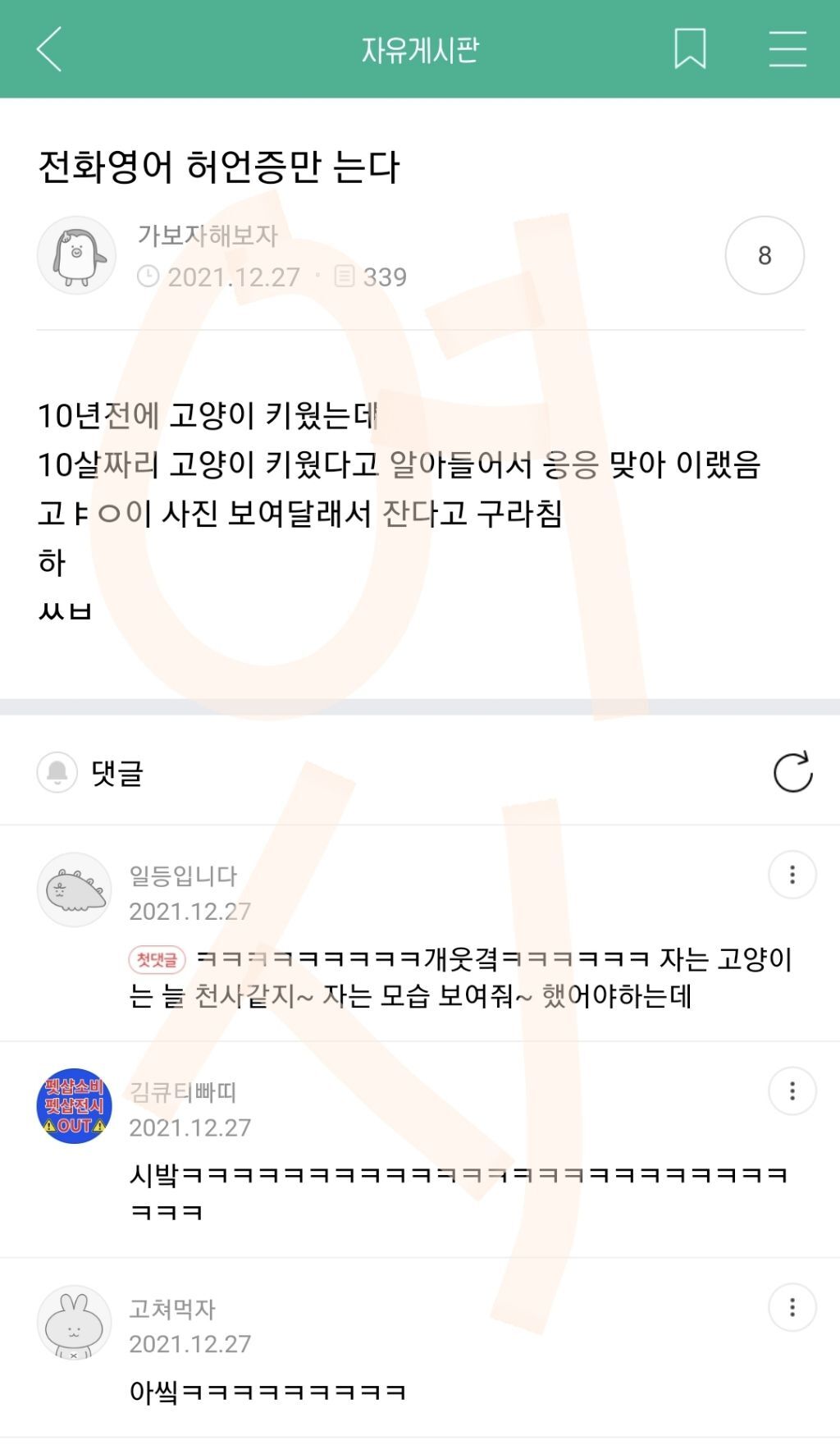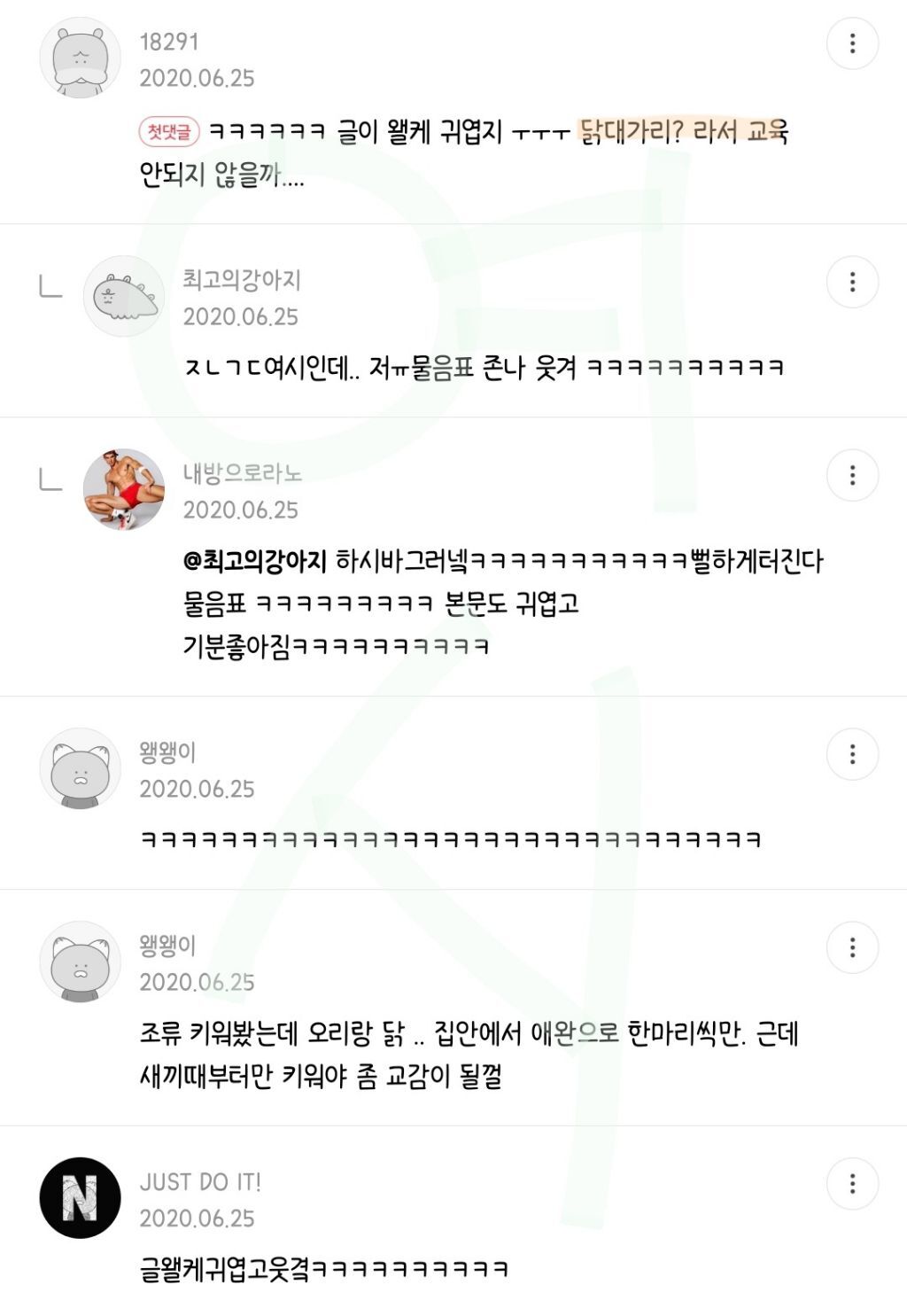 작성자이게머선일이야이렇게좋은날에 작성시간 22.01.20 앜ㅋㅋㅋㅋㅋㅋㅋㅋㅋㅋㅋㅋㅋㅋ고츄랑 코골이깨우는거 왜케 웃기냐곸ㅋㅋㅋㅋㅋㅋㅋㅋㅋㅋㅋㅋㅋㅋㅋㅋㅋㅋㅋㅋ