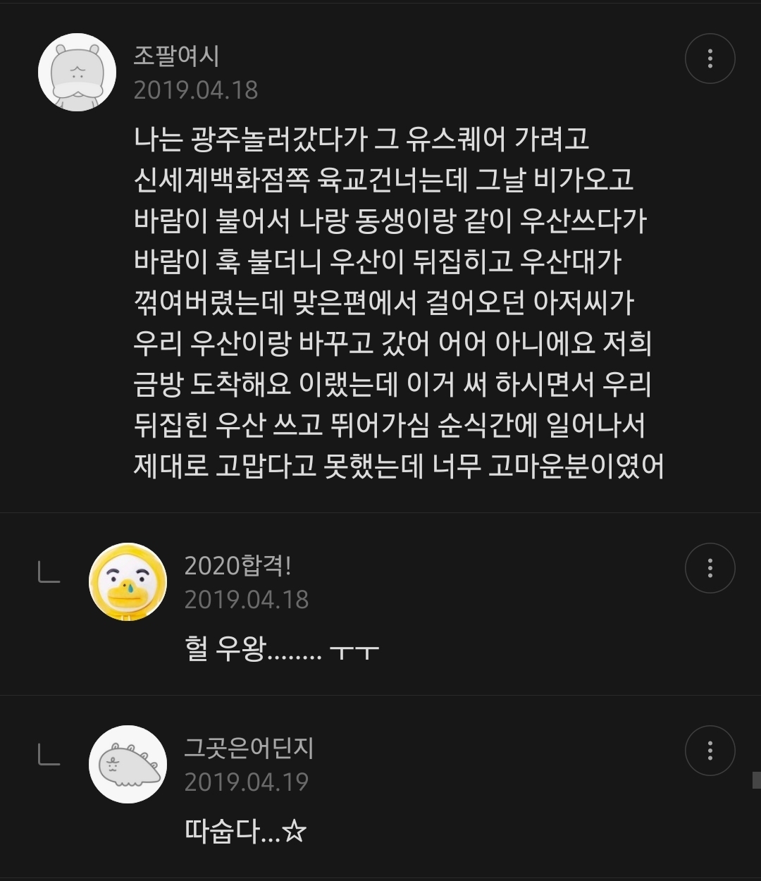가까운 정형외과 찾아서 엘레베이터도 없는 병원 계단을 부축해서 데려다 주시고 나 치료 받는 동안 홀연히 사라지셨어 감사 인사도 제대로 못했는데