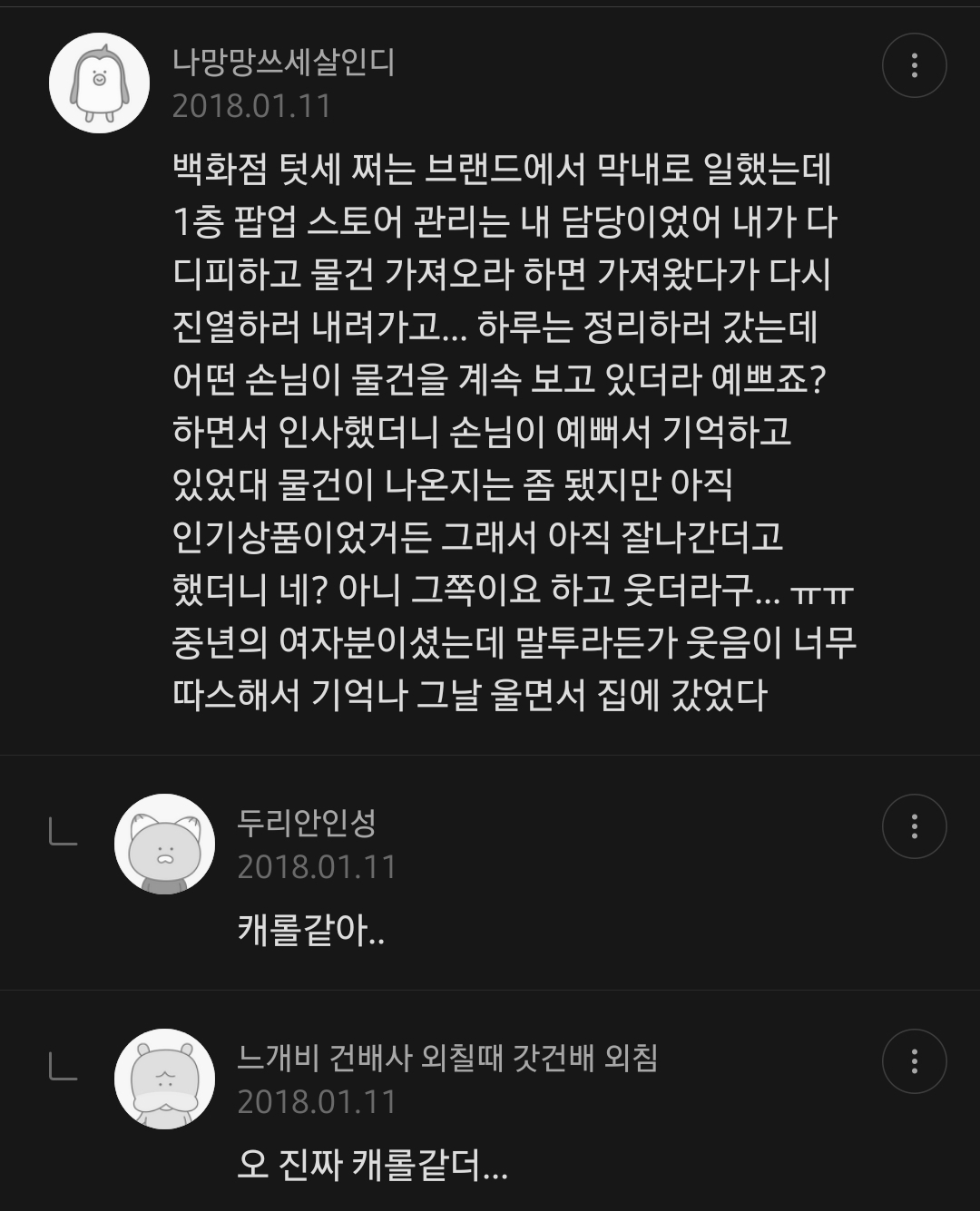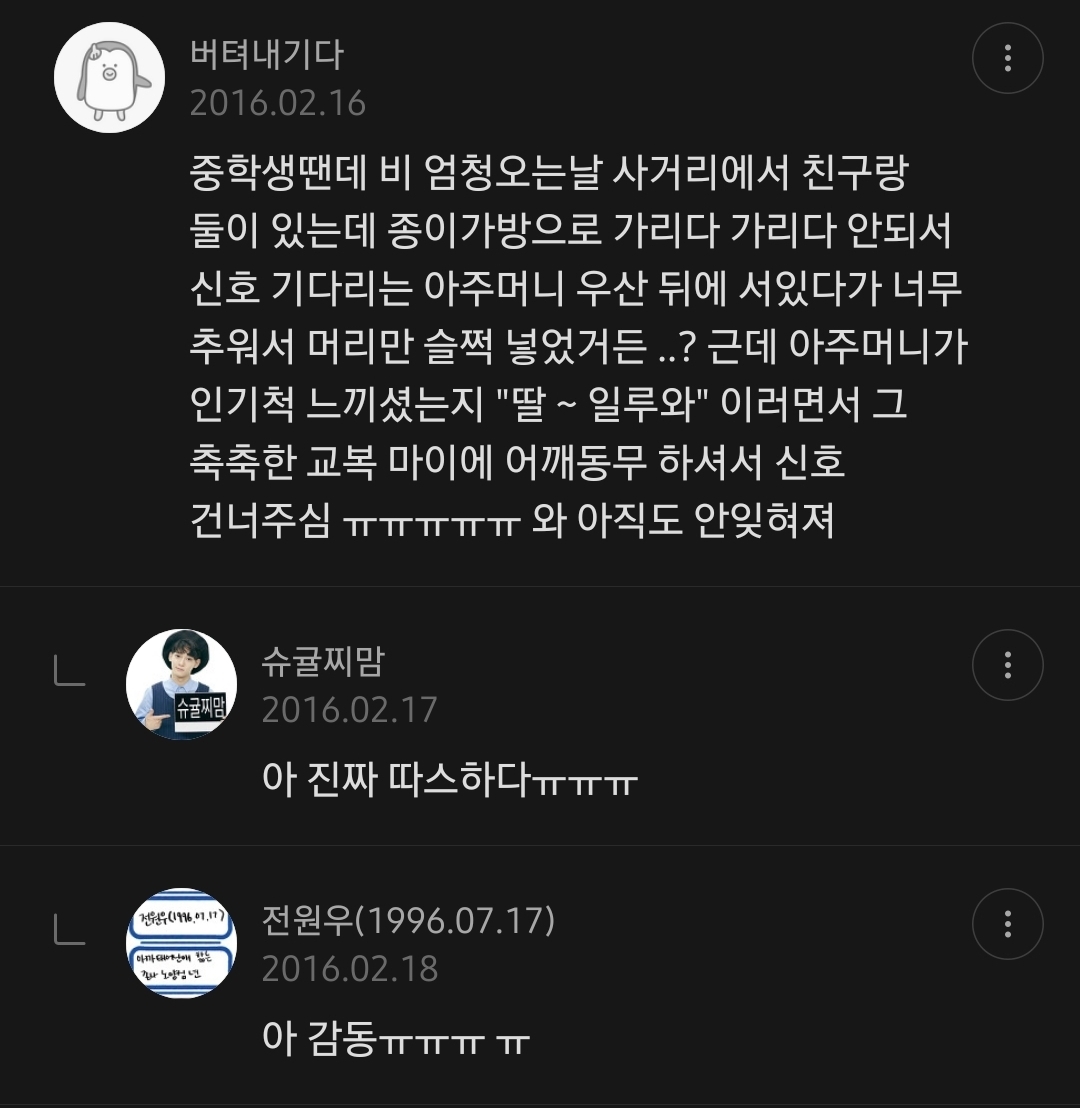 작성자잠시 구름이 멈추는 소리 작성시간 22.03.24 새벽에 잉잉 울고 있다. 나는 좀 힘들었을때 겨우 아는 사람 통해서 알바를 했어. 그때 진짜 우울증 심했을 땐데 일은 열심히 했어. 24살짜리가 속으로는 무서웠지만 그냥 용기를 내봤던 때야. 출근 이틀째였나 손님으로 아마도 80대-50대쯤 될 모녀 고객님이 오셔서 옷 보시는데 외투 봐드리고 같이 골라드렸거든. 근데 그때 고객님이 우리 손주보다 싹싹하니 너무 예쁘다고 내가 줄 건 없고 한 번만 안아보자 하시면서 안아주시는 거야. 그래서 안겼고 결제까지 다 해드렸는데 울음 참느라 혼났어. 눈 벌게져서 인사하니깐 매니저 언니가 먼저 퇴근하라 했고 집 가는 길 내내 울었어. 울 할매 돌아가신지 1년 좀 넘었나 그랬을 때거든. 그 시기에 우울 터졌던 것도 할매 보낸 게 컸는데, 그때 그 포옹이 얼마나 위안되고 얼마나 소중했는지. 내가 그 잠깐의 온기로 얼마나 죽지 않고 버틸 수 있었는지 종종 생각해. 어르신 건강하셨으면 좋겠다. 감사했어요 정말 많이.