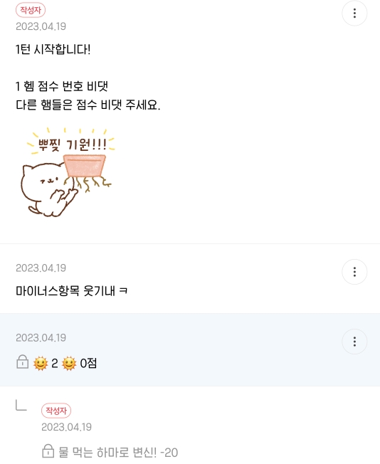 근데 1햄이 고른번호가... 2번이었다죠ㅋ (서로 부른 번호는 알려주지 않음) 연속 물먹고, 용호초 호출당함.