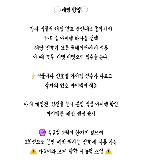 식물 마다 1나개의 마법을 사용할 수 있는데 다육이는 랜덤으로 점수를 바꾸거나 식물을 바꿔치기 할 수 있음