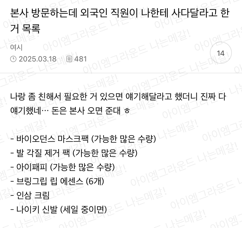 (참고로 글쓴직시 인삼크림 빼고 다 사줬다네요 천사가 따로 없음)