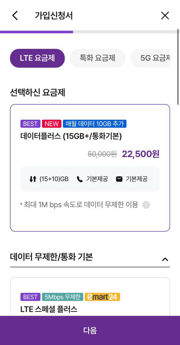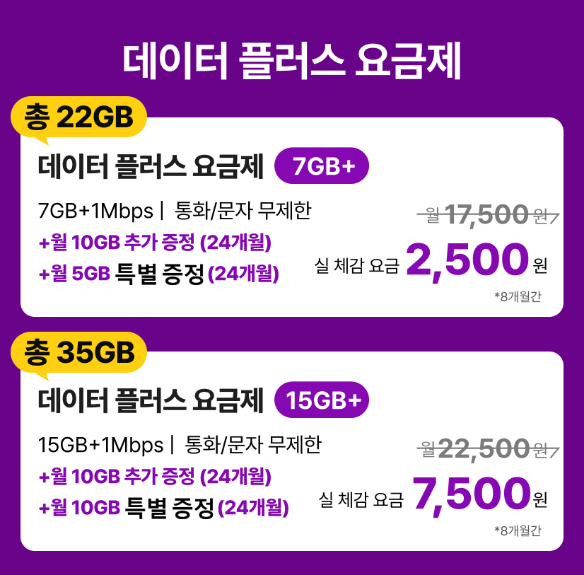 ⭐ 데이터플러스 15GB 요금제 가입 (*총 35GB)