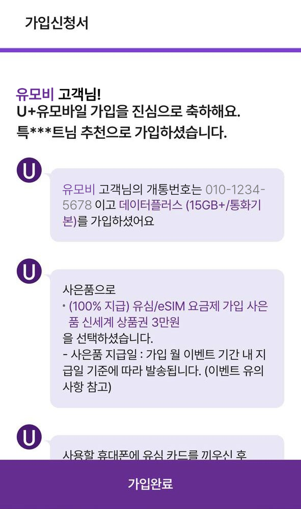 별도 유심을 구매하여 가입한 경우만 추천인 아이디 란에 upromotion 기입 해주셔야 혜택이 증정됩니다.