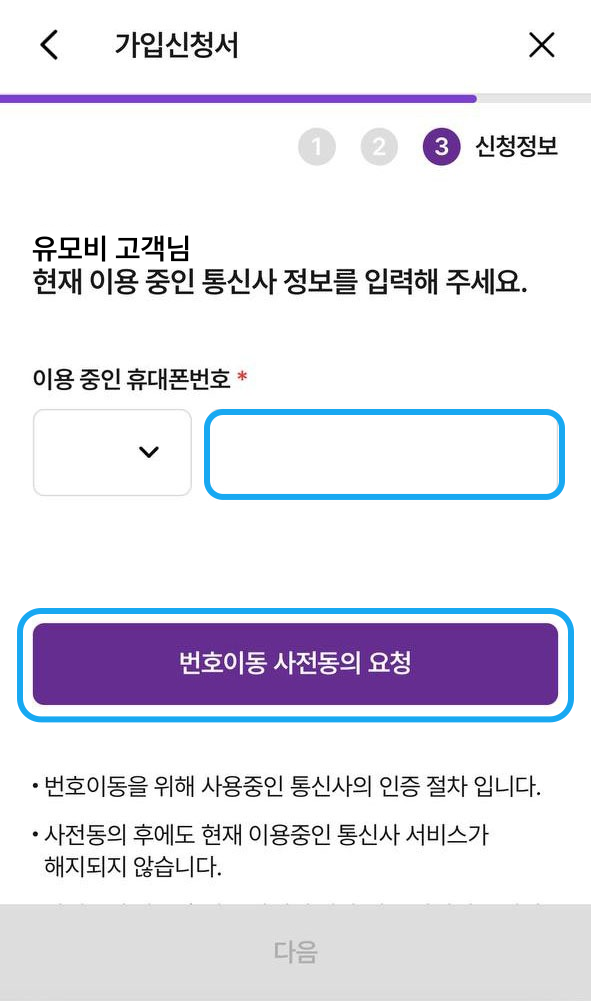 * 이전 통신사 정보가 뜨지 않는 경우, 상담원 개통을 진행해주세요.
