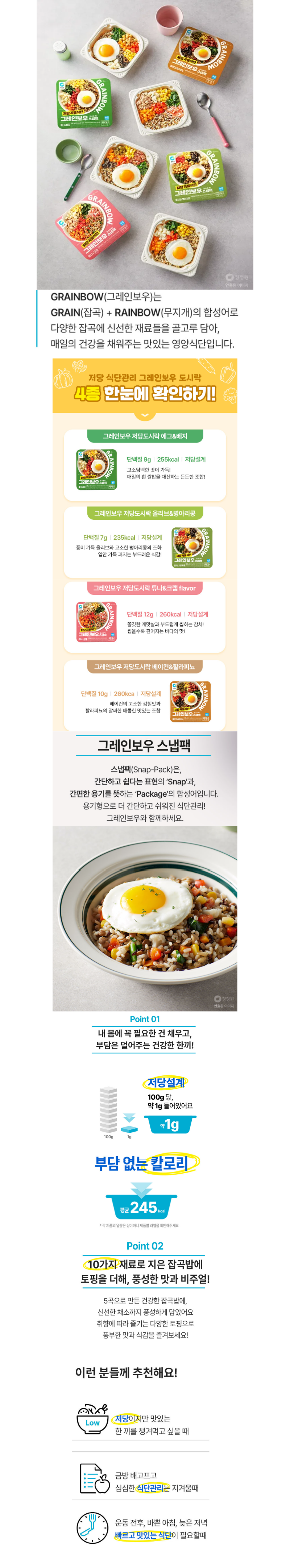 - 최소 10가지 이상의 잡곡 & 채소로 구성된 균형 잡힌 한 끼