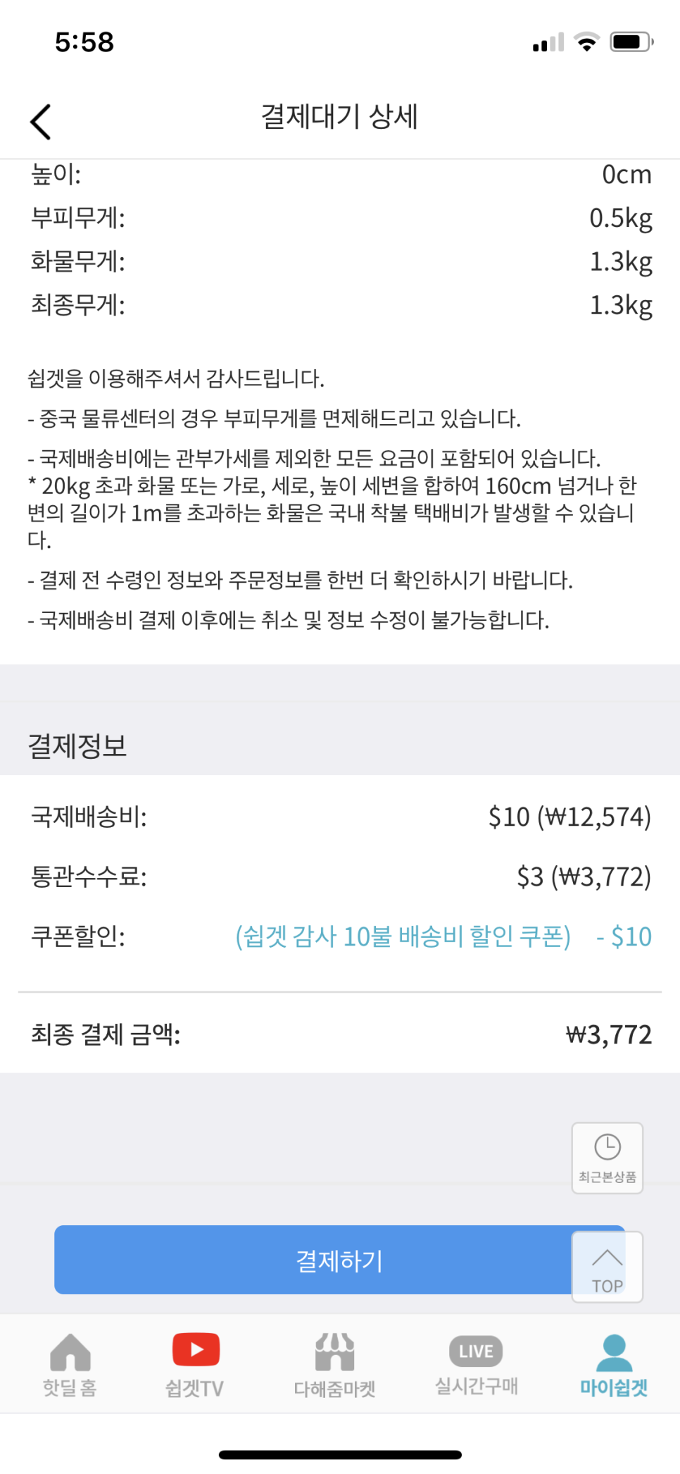 배송비는 10$ 무료쿠폰 사용해서 수수료인 3772원만 결제했다.