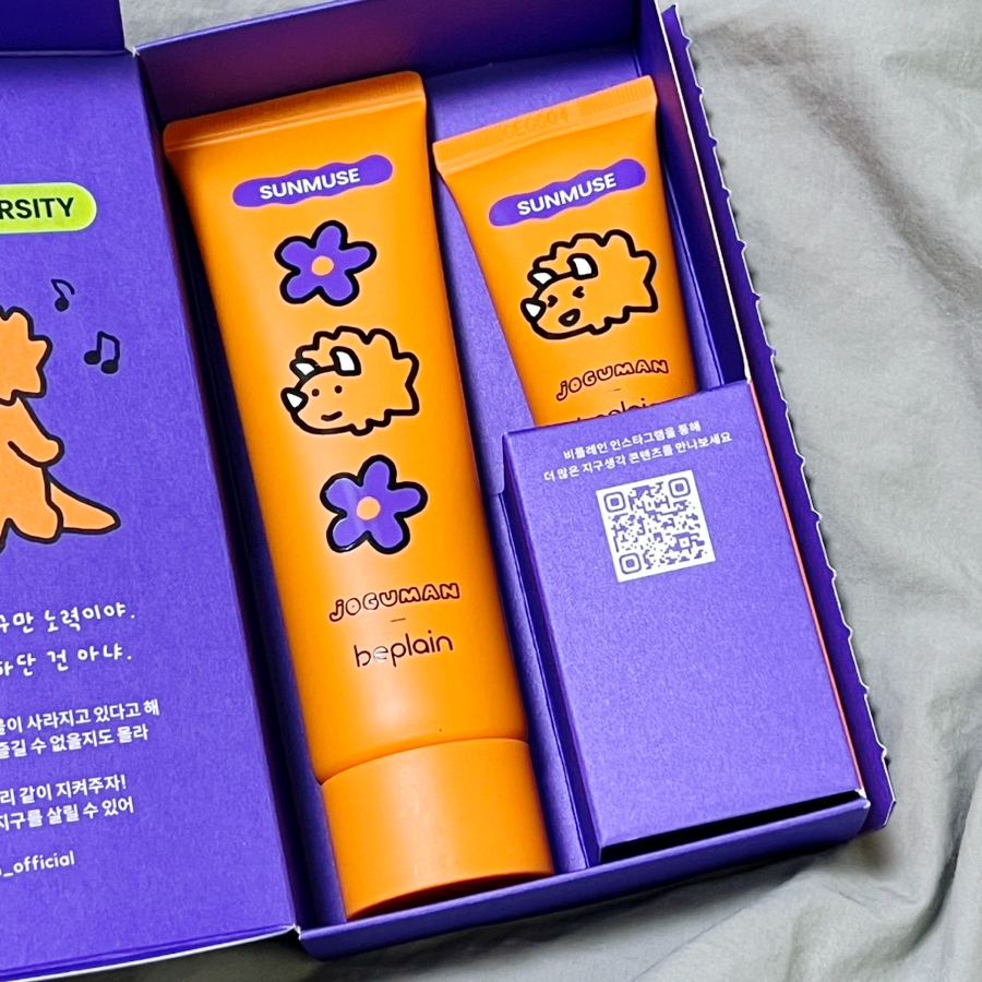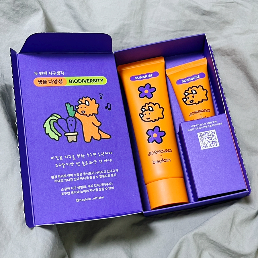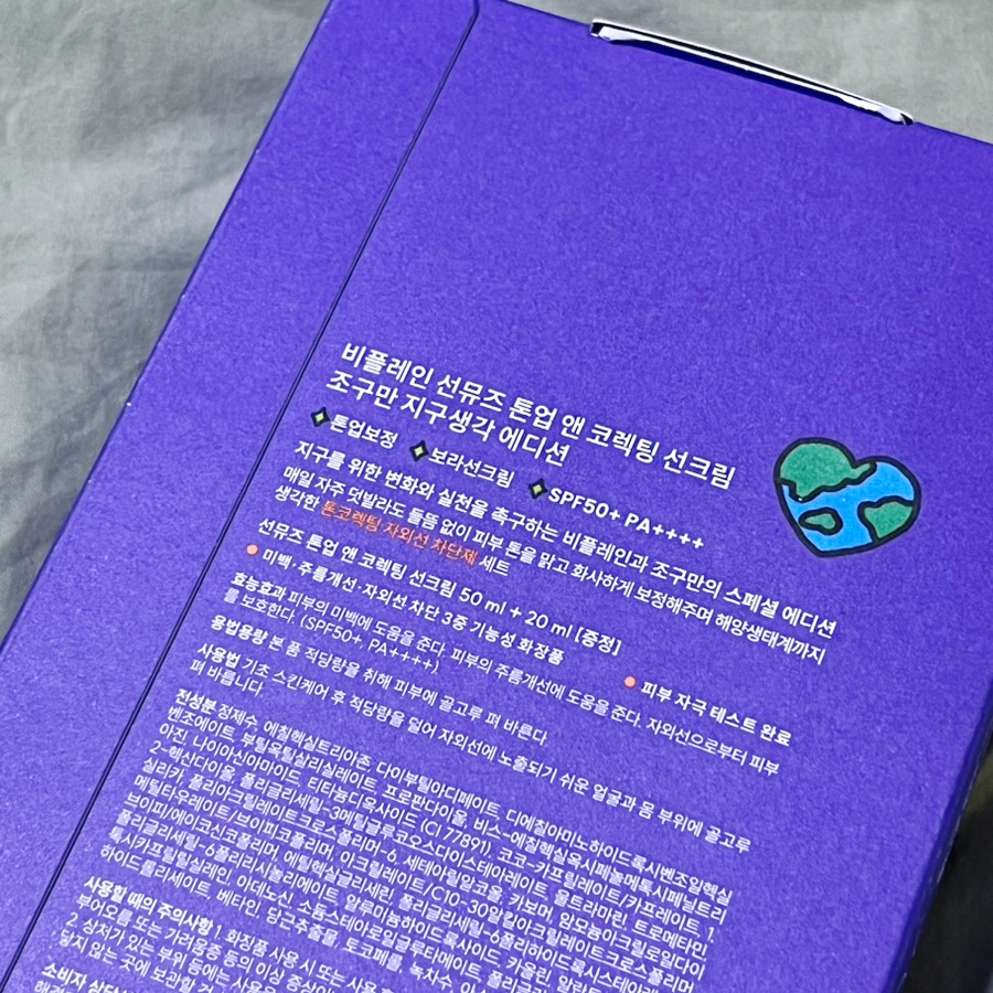 비플레인 선뮤즈 톤업앤코렉팅 선크림 조구만 지구생각 에디션은 보라선크림 이름에 걸맞게 보라색 박스에 담겨있어요.