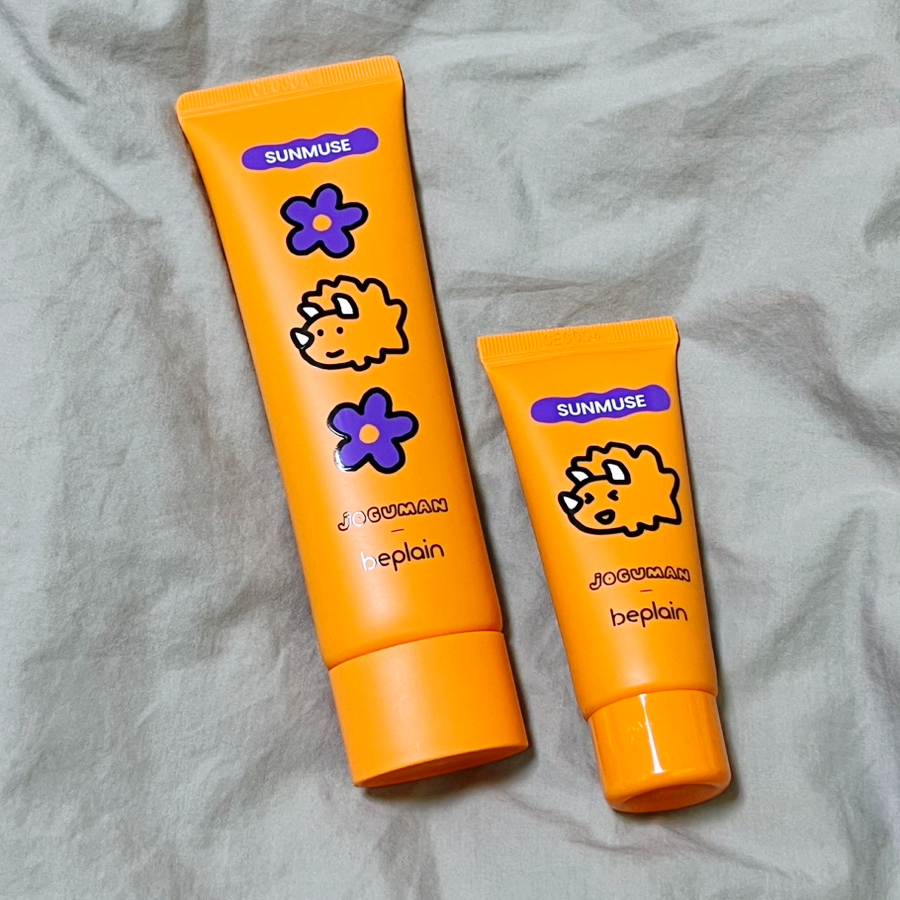 우측에 비플레인 선뮤즈 톤업앤코렉팅 선크림 본품과 여행용 미니사이즈 선크림이 함께 들어있어요.