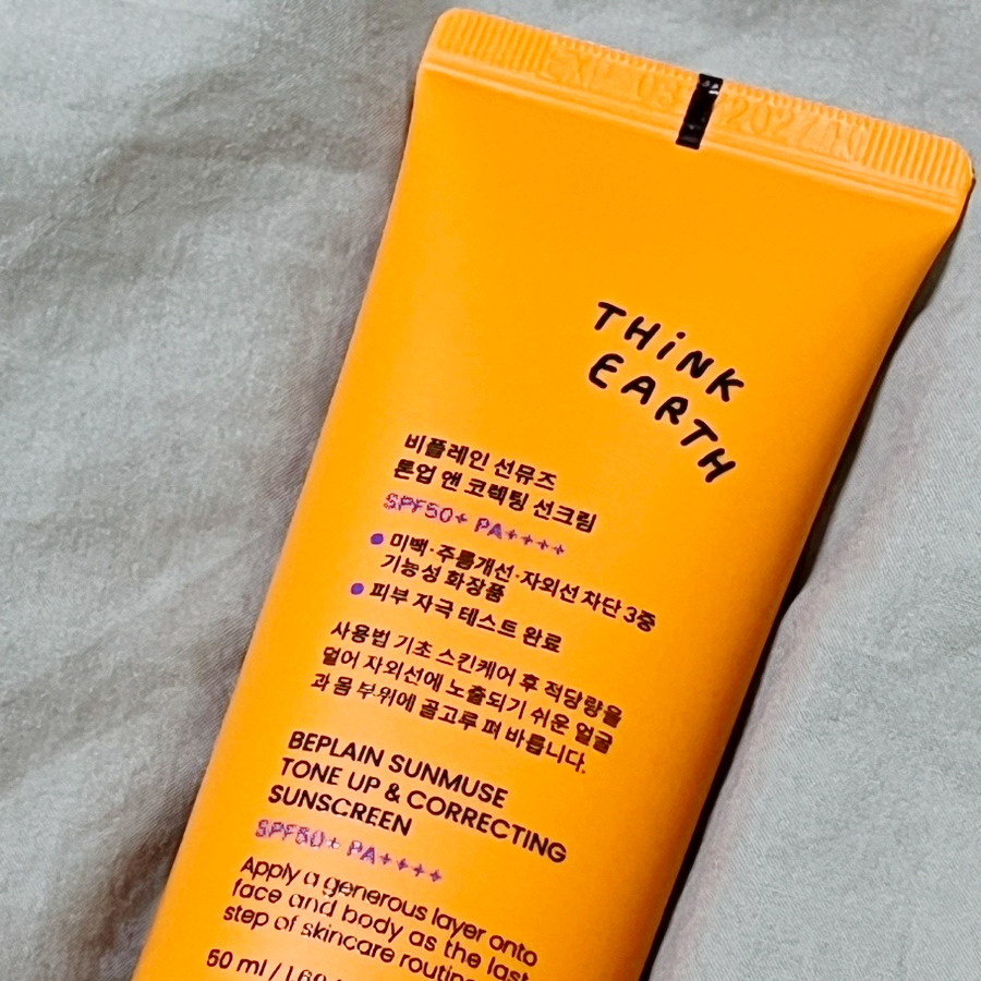 비플레인 선뮤즈 톤업앤코렉팅 선크림은 발림성도 좋고 톤보정이 확실하게 되어서 사진에 보이는 것 만큼 소량 발라도 충분히 바를 수 있어요!