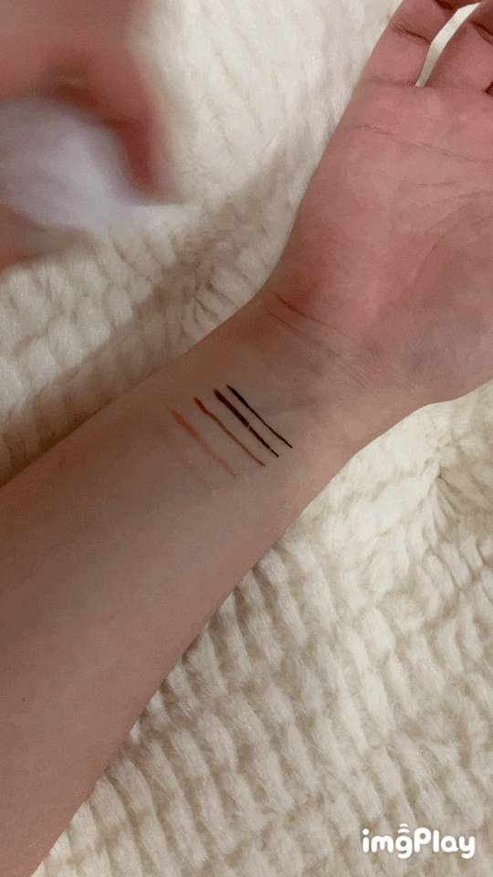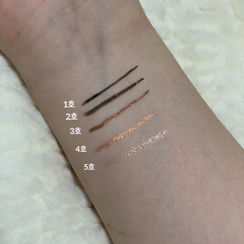 손목에 발색 해보았습니다. 부드럽게 발색되고 한번에 또렷하게 발색이 됩니다. 1호부터 5호까지 색깔 스펙트럼이 다양하여 여러 용도로 활용하기 좋을 것 같습니다. 제가 발색 해 보았을 때 특히 4호가 다용도로 사용하기 좋고 색깔이 예뻣습니다. 그러나 5가지 모두 부드럽게 발색되는만큼 제품이 물러 뾰족하게 꼬리를 그리고 싶다면 수시로 깎아줘야 될 것 같습니다.