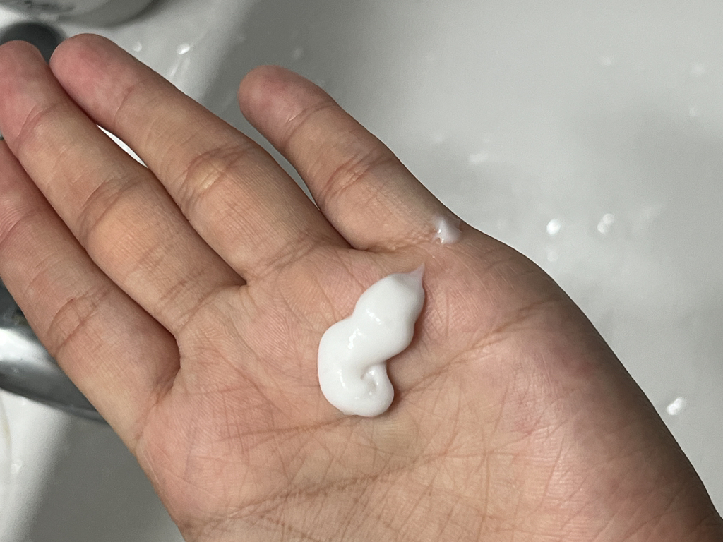 우선, 반 펌프? 정도 짜면 이 정도의 양이 나오는데 꾸덕꾸덕한 로션 느낌의 제형이라 손바닥을 뒤집어도 떨어지지 않습니다! 그만큼 잘 달라붙는 재질이라는 것 확인 할 수 있습니다!