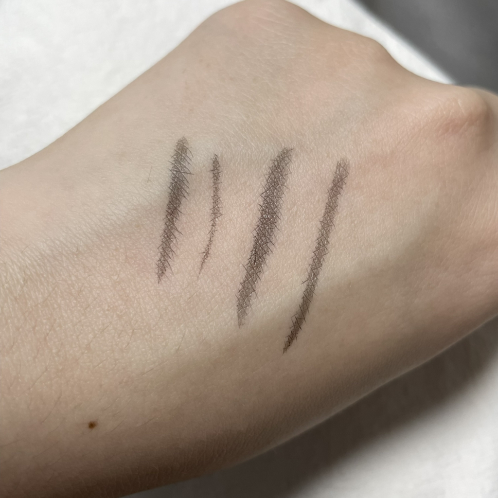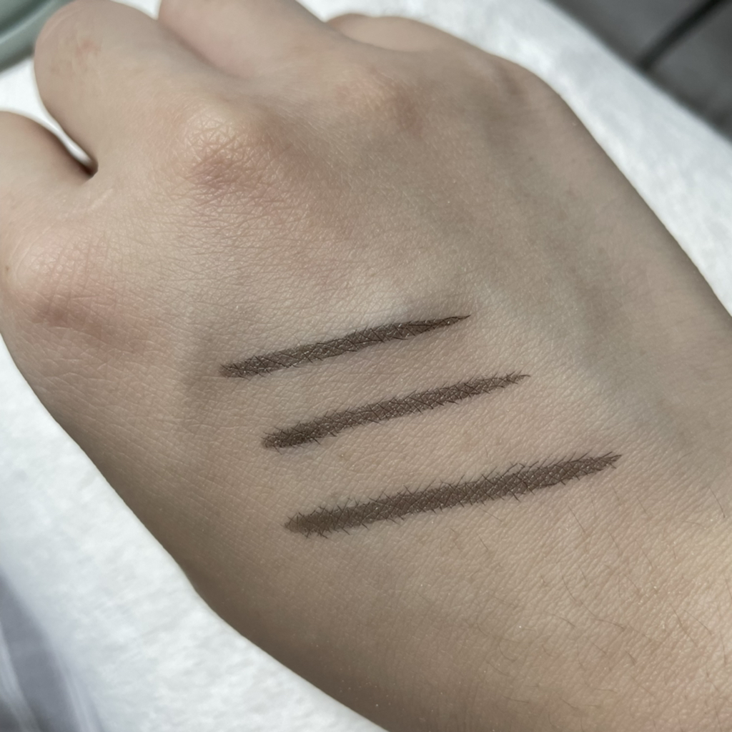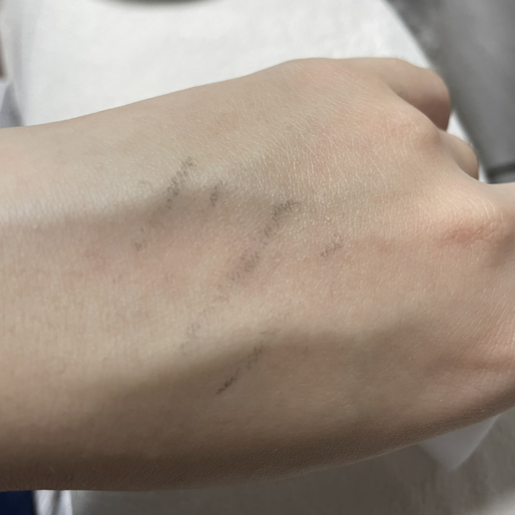 반대편 손등에 파우더를 먼저 팡팡팡!! 뚜드린 다음에 선을 그어봤더니 확실히 번짐이 사라지더라구요!! 발색도 윗 사진에 비해 진하고 예쁘게 나왔죠? 엄청 신기했어요ㅋㅋㅋ ((무보정 기본카메라)) 제일 아래 선은 제가 예쁘게 그리고 싶어서 손을 덜덜 떨었더니 속도가 너무 느려서인지 쪽끔 번졌어요^^,, 하하하
