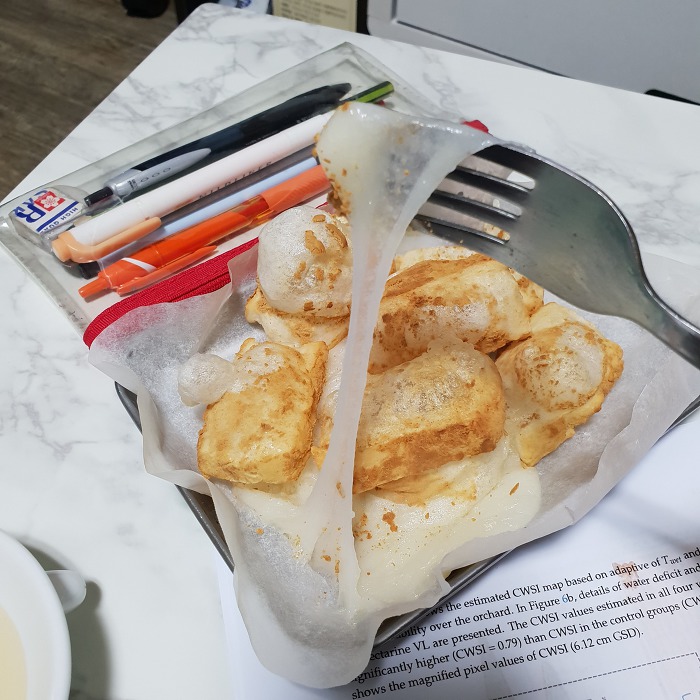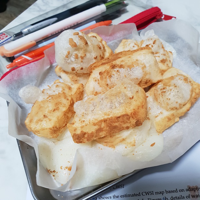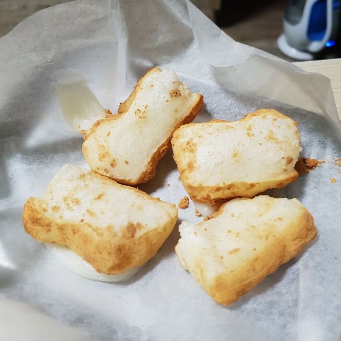 후라이팬에 하는거는 계속 뒤집어줘서 부풀지는 않아.. 그래도 맛있다..