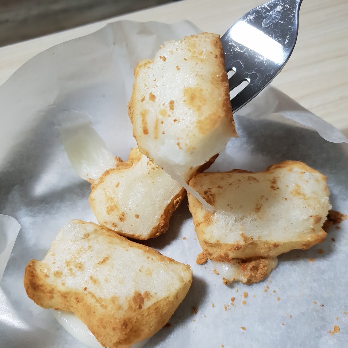 1. 종이 호일을 깔고 얼린 인절미를 적당히 올린다 - 서로 붙어있지만 않으면 돼