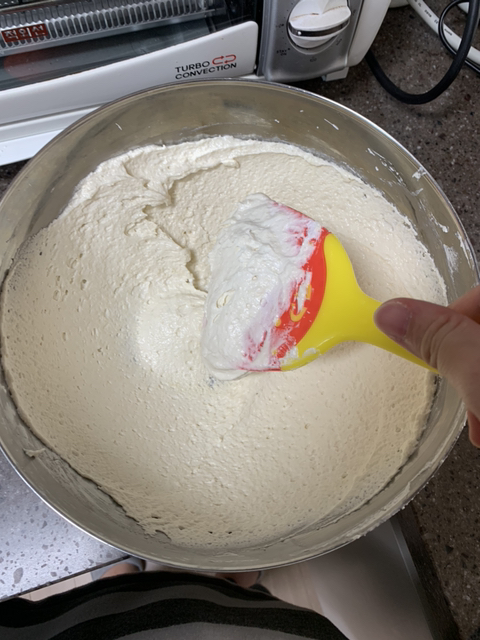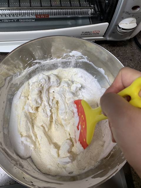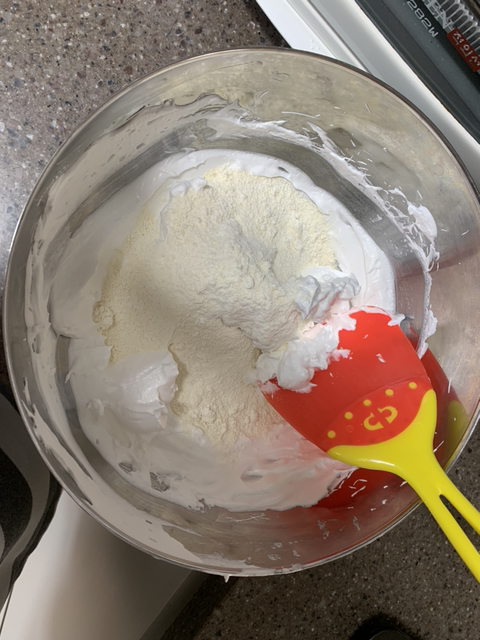 어떤사람은 머랭 위에 바로 채반 사용해서 채친다음 섞는 사람도 있어~ 정답은 없고 개인 스타일이야!!
