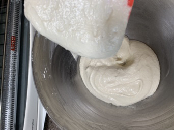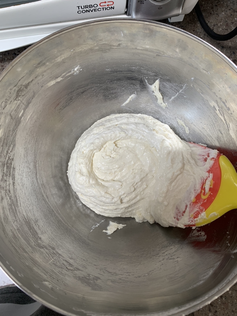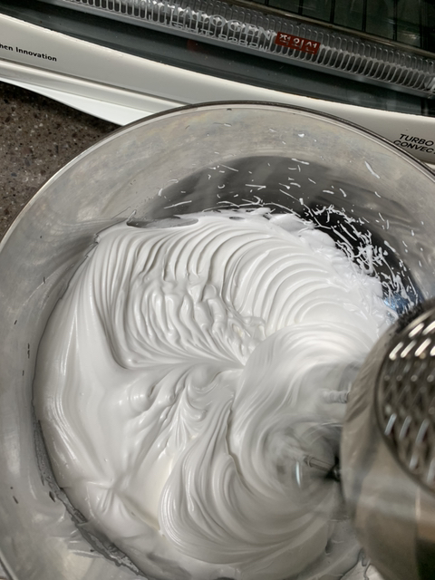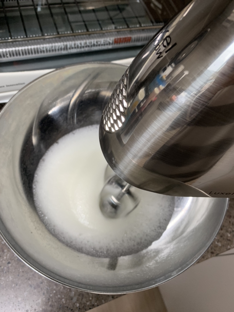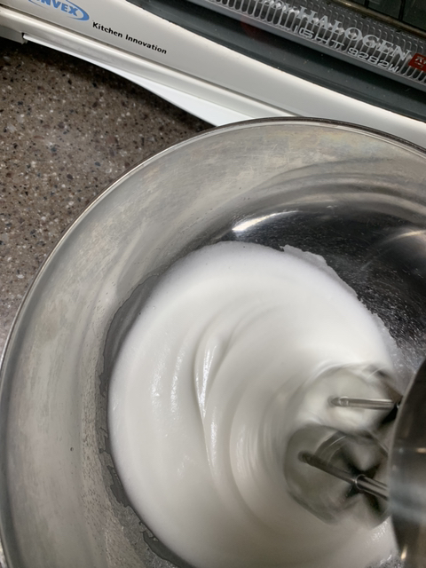 이 때 최대로 거품을 올릴 수 있을 때 까지 올려준 다음 계량한 설탕을 3번 나누어서 넣으면 돼!!