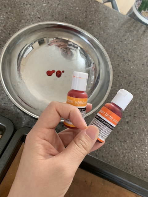 두 가지 색소를 사용한 이유는 오븐에 구울 때 색이 날라가서 구워진 듯한 안 예쁜 색이 나오기 때문에 여러가지를 섞어서 넣습니다. (사람들 보니깐 조색한다고 표현하드라궁!!)