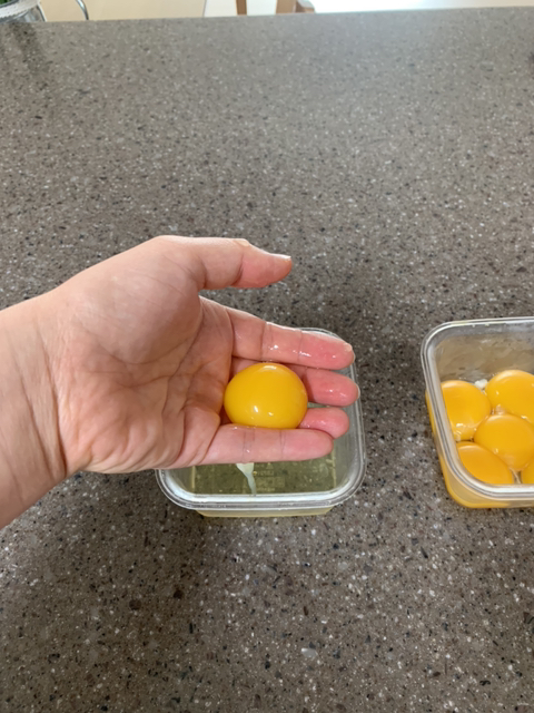 초보의 경우 계란을 분리 할 때 손을 오목하게 만든 다음 그 위에 계란을 놓으면 돼~