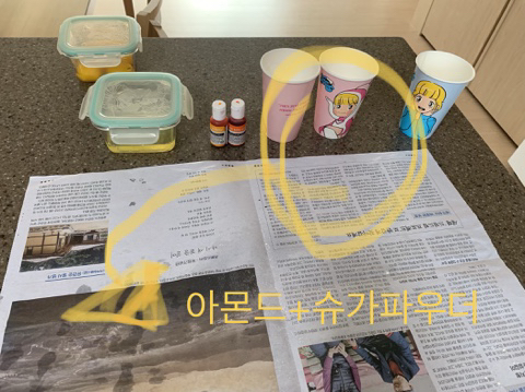 나는 편의상 채친 아몬드 가루+슈가파우더를 컵 두개에 따로 담아서 하나씩 부어가며 사용해!!