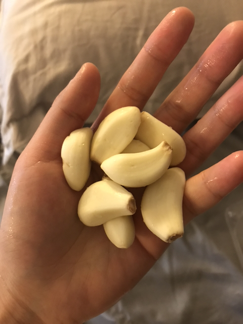 (이것도 너무 얇으면 식감 별로임. 마늘 한 쪽에 3-4조각 정도 나오도록 자르거나 썬다. 투척.)