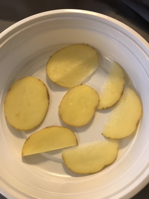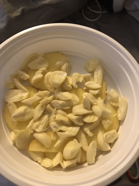 3-2. 2분이 지나면 꺼내서 감자는 깔린 채로 두고 마늘과 베이컨을 뒤적뒤적 섞어준다.