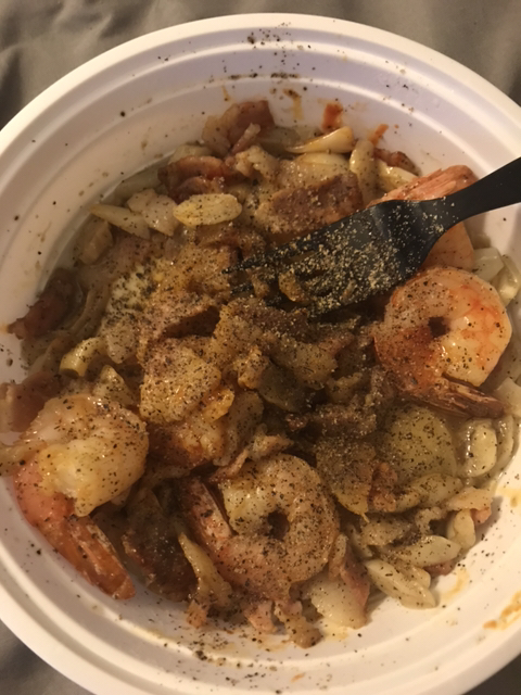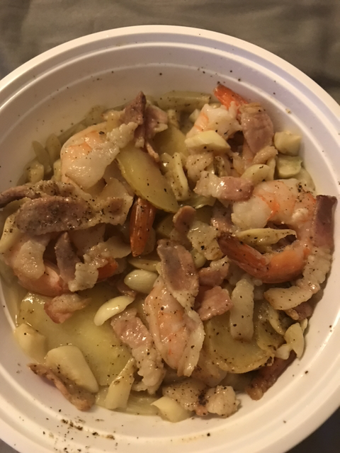 내가 쓴 재료: 버터, 감자, 베이컨, 후추, 마늘, 냉동 새우, 바질 가루