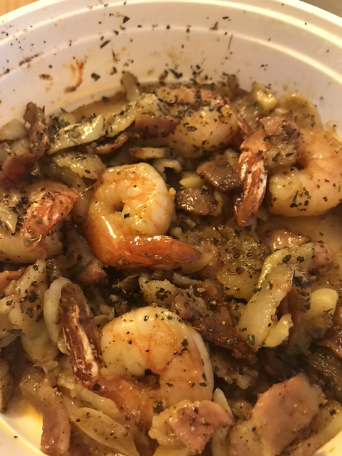 5-2. 2분후 꺼내서 새우 위로 배이컨과 마늘이 올라가게 위치 변경. 여기서 다시 전자레인지로 2-3분