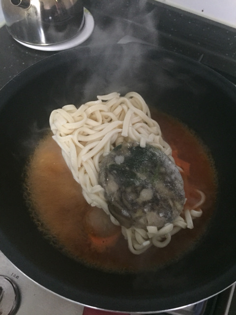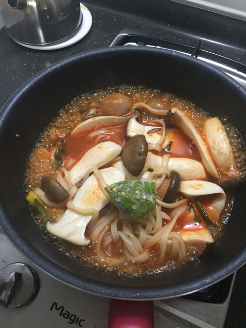 물이 팔팔 끓으면 양념소스넣고 면이랑 건더기 넣어줌.