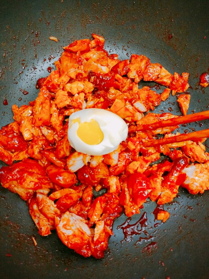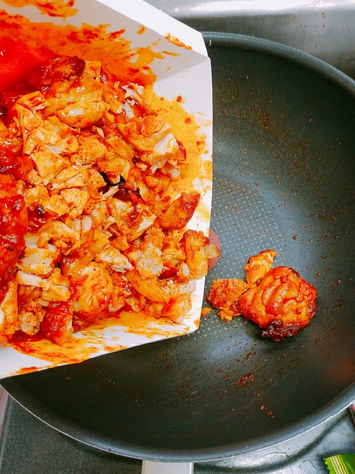 4) 볼케이노 치킨 몇 조각을 넣고 불닭볶음면 소스를 넣어