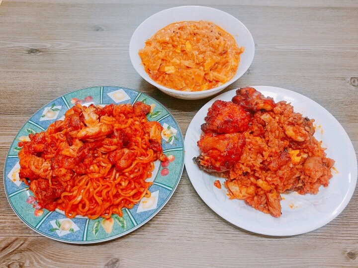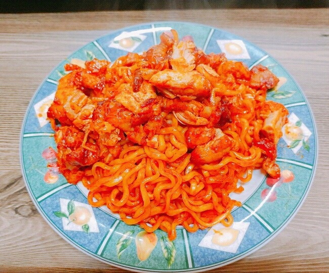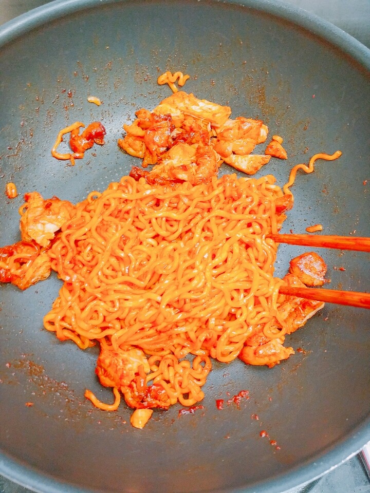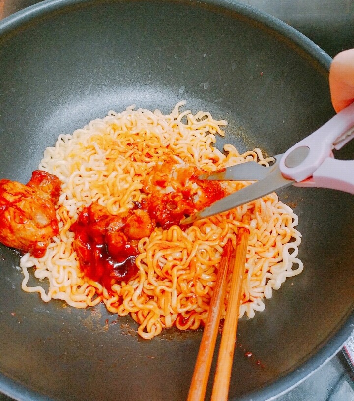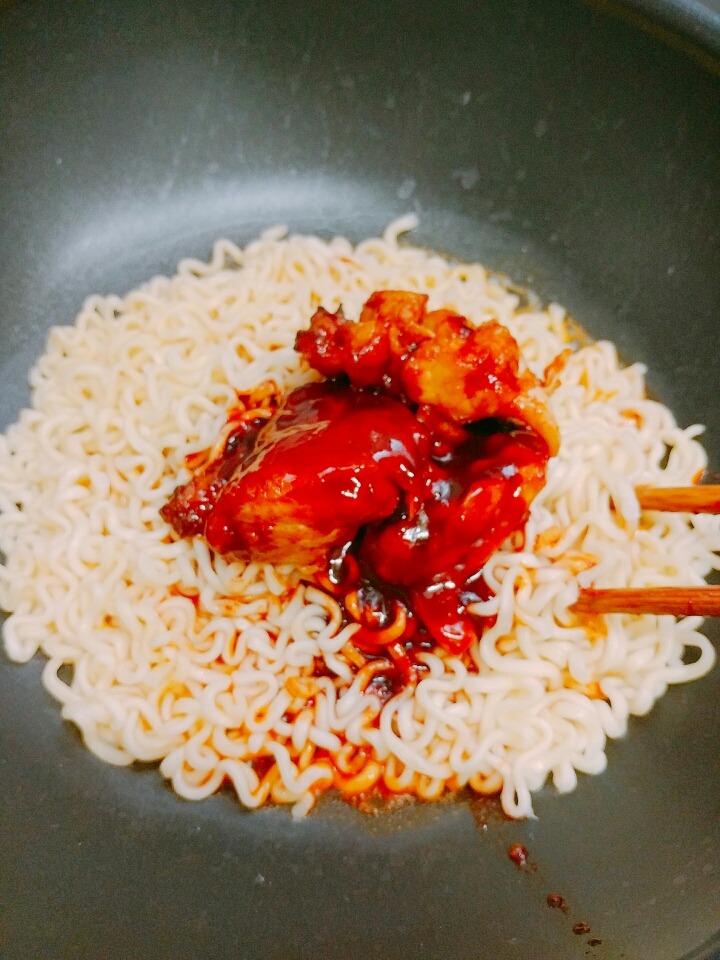 볼케이노 치킨 다른 팬에 볶다가 물기뺀 면 넣고 볶으면 될거야!)