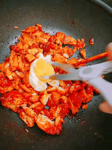 3) 아까 까뒀던 계란을 넣어줘 그리고 작게 잘라줘!