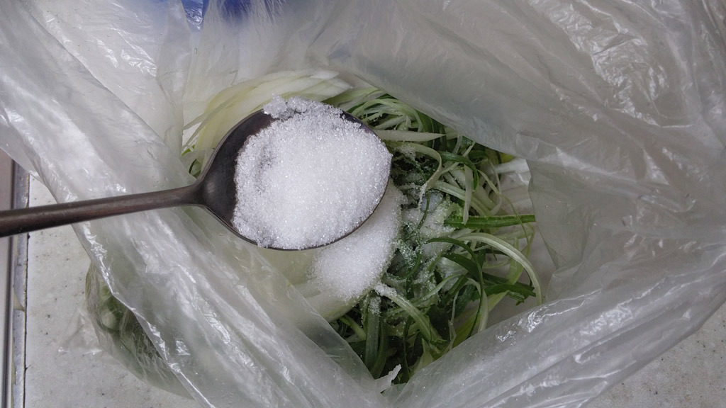 봉다리에 파채넣고 설탕 한큰술을 넣어주세요