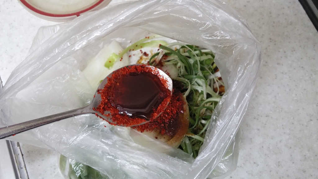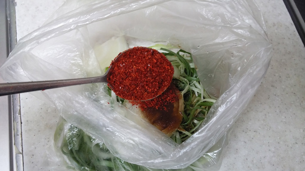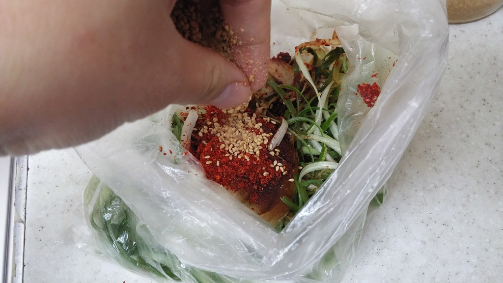 고춧가루 1큰술, 참기름 반큰술, 깨 적당량