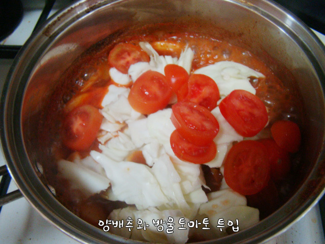 고춧가루 1수저로 줄이고 양배추 썰어넣고