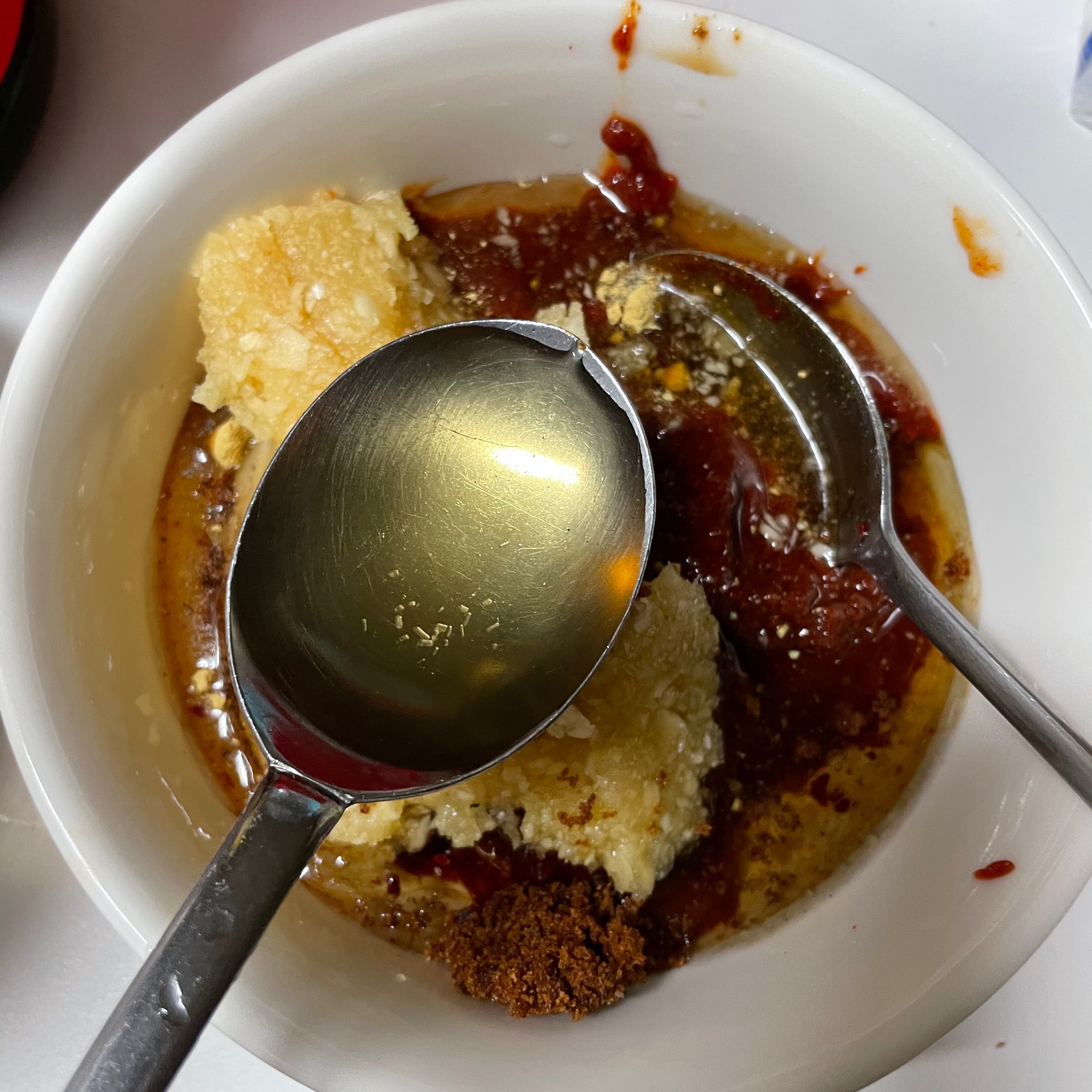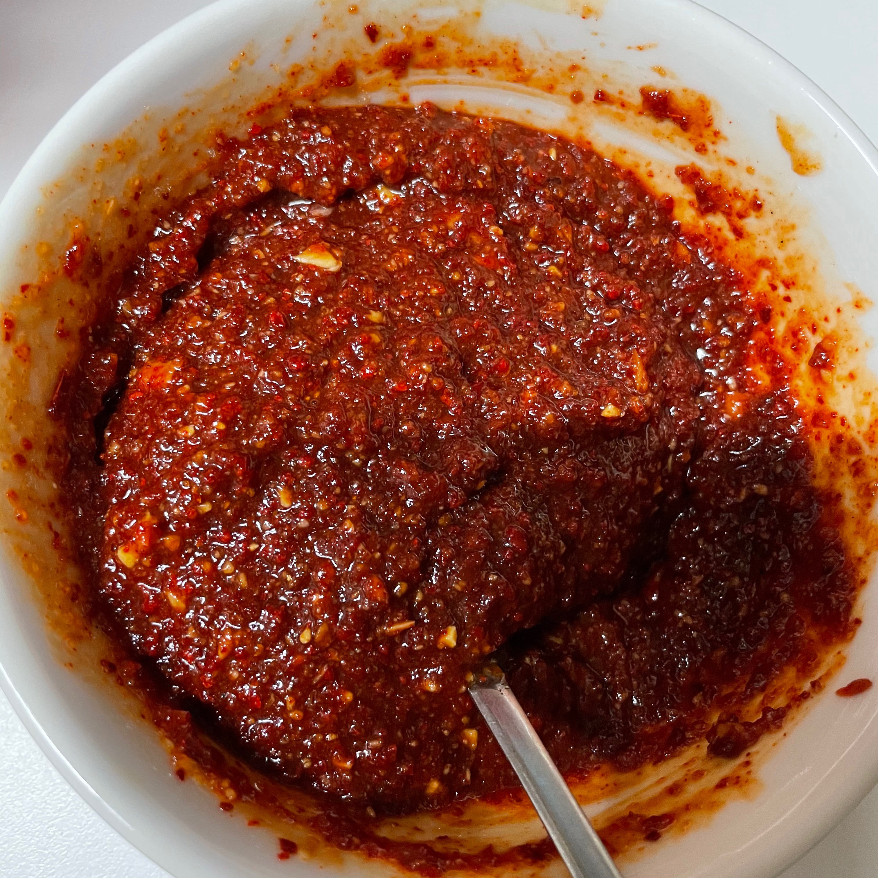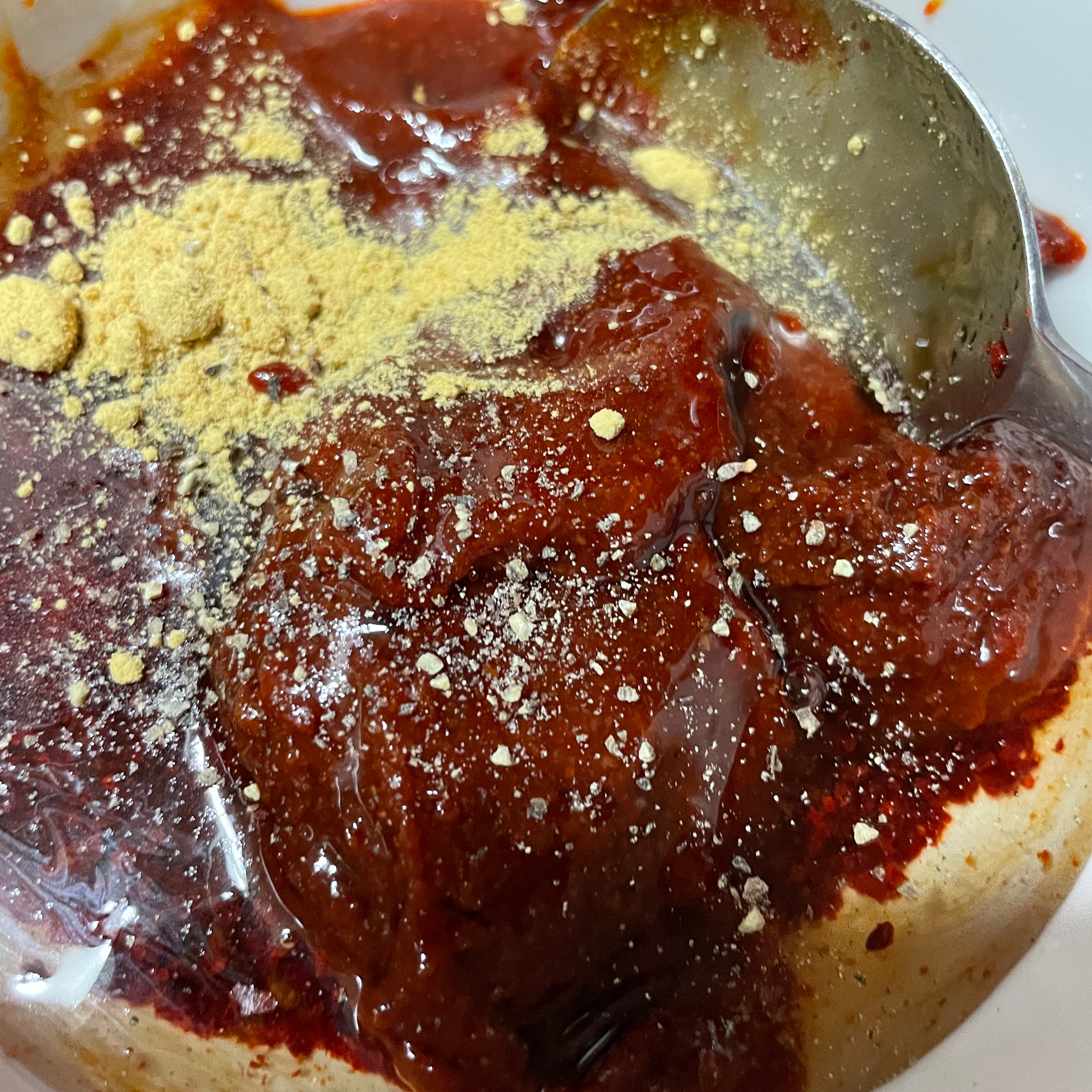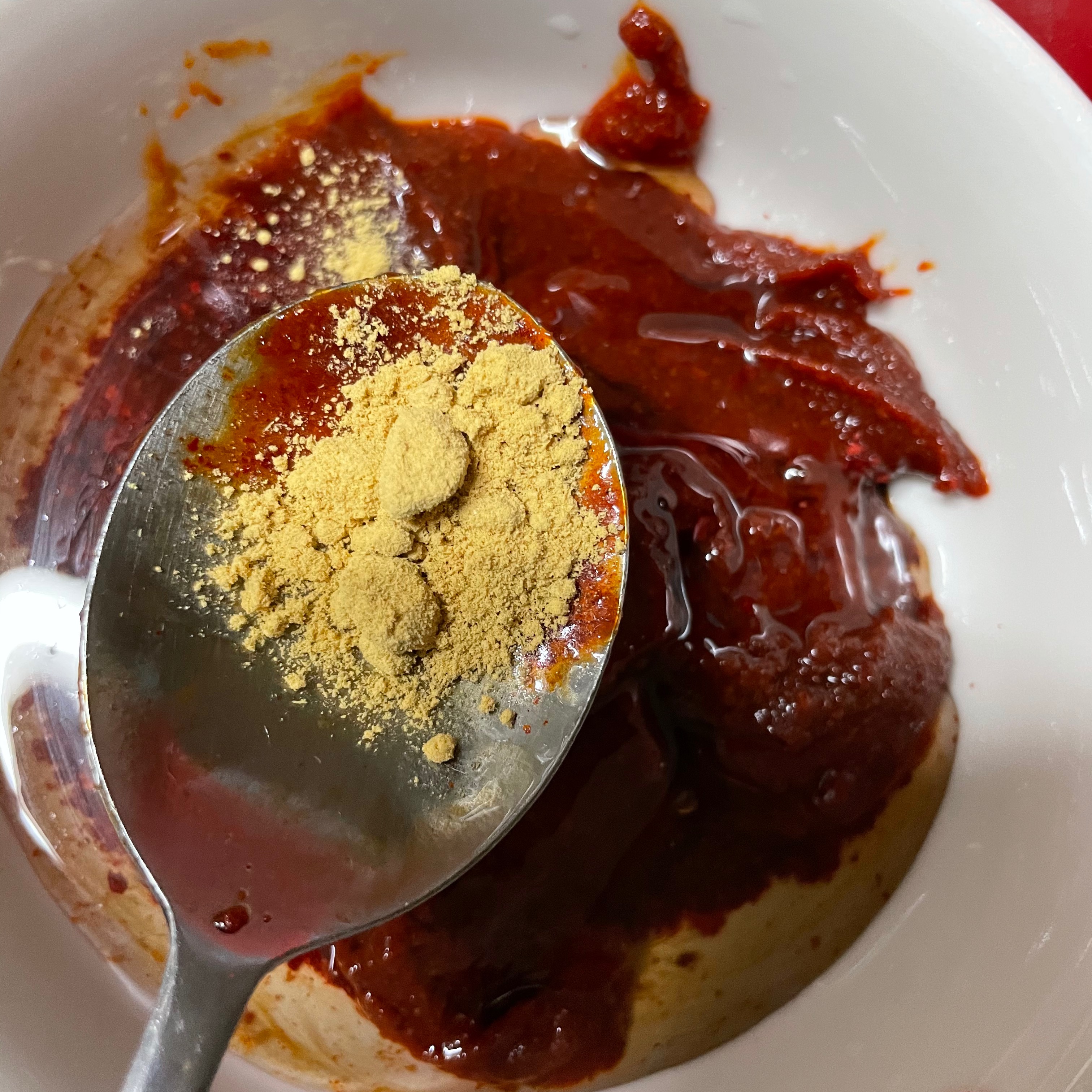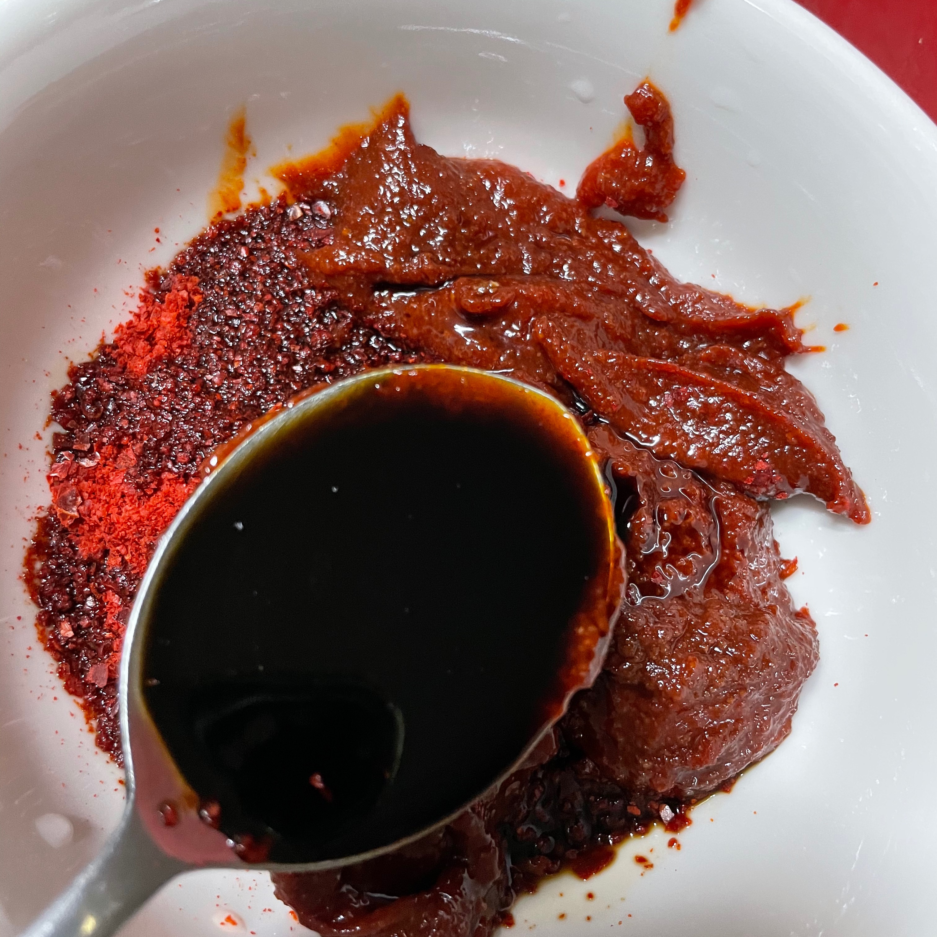 고추장 3스푼, 고춧가루 4스푼, 다진마늘 4스푼, 진간장 4스푼, 까나리액젓 2스푼, 맛술 4스푼(생강, 생강가루 0.5스푼 대체 가능), 물엿 3스푼, 후추 툭툭툭툭툭, 소고기 다시다 0.5스푼, 미원 진짜 조금 숟가락 끝에 묻었다 할 정도