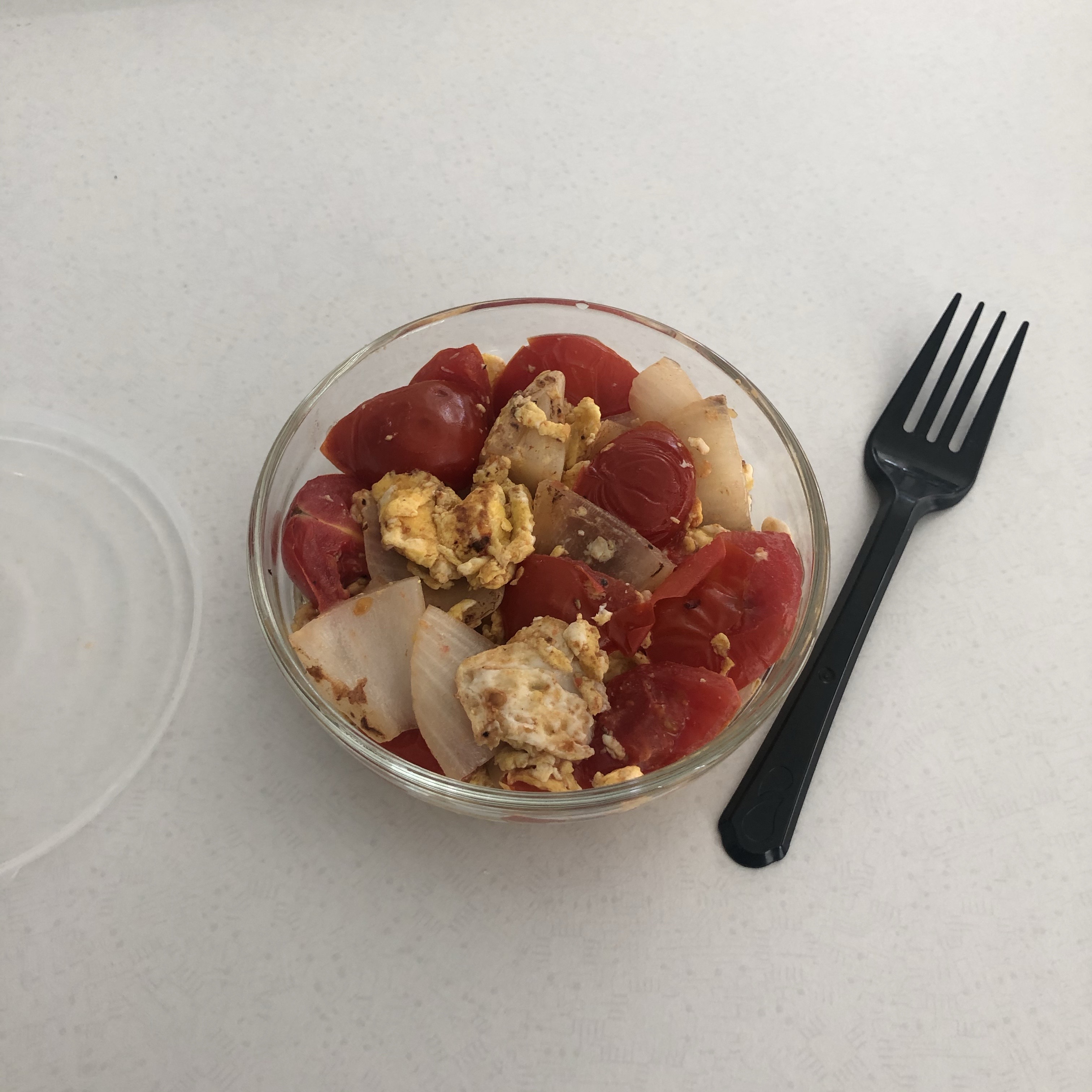 중불에 계란 좀 스크랩블 하다가 양파넣고 토마토 넣고 스리라차소스 좀 넣고 볶아버려~
