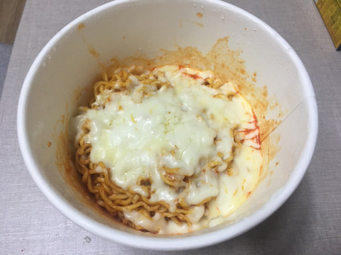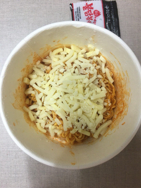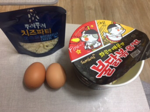 준비물: 계란 두개, 뿌리는 치즈, 불닭볶음면 큰컵