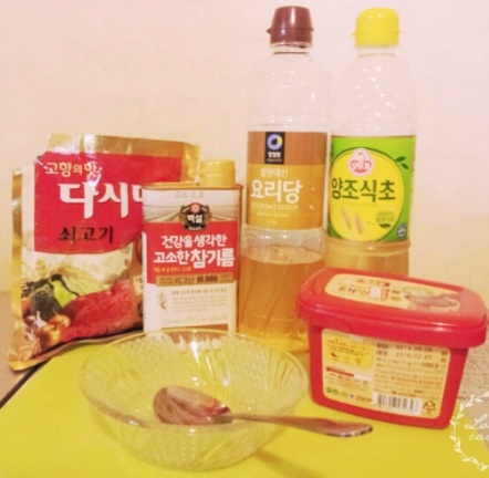 준비물: 고추장, 식초, 다시다, 물엿, 참기름