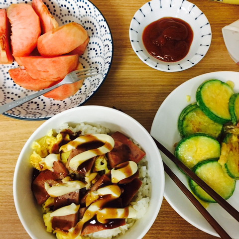 3 밥위에 스팸, 계란 올려주고 마요네즈 집에 굴러다니는 돈까스 소스 뿌려주면 완성
